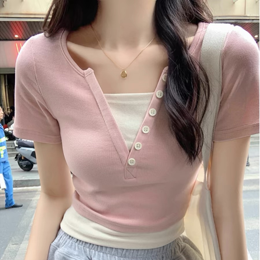 假二件纯欲短袖T恤女2025新款爆款洋气时髦小众设计感甜辣风上衣