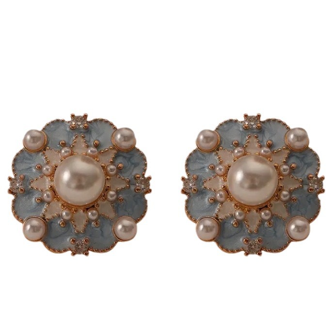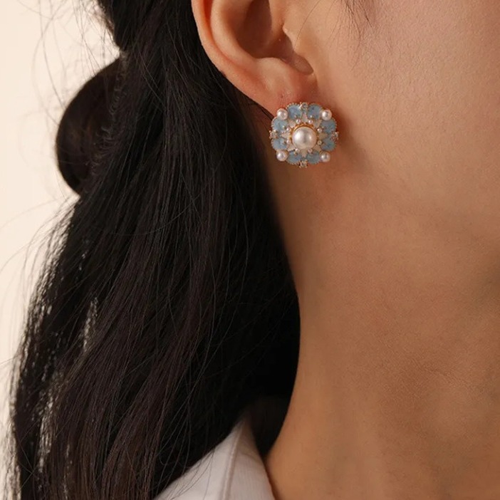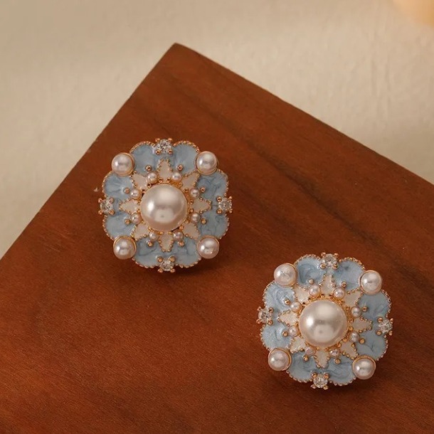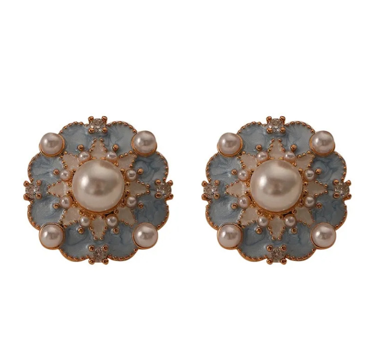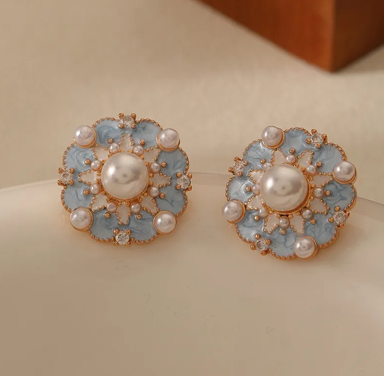 法式小众蓝色珐琅花朵耳钉轻奢锆石高级感耳环复古时尚气质耳饰品