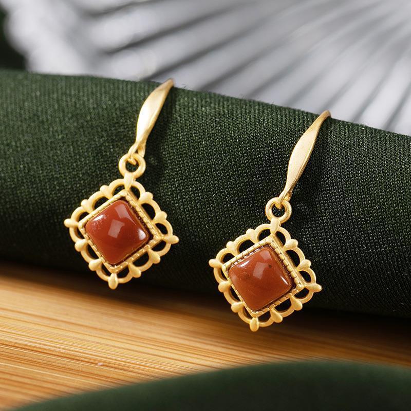 国色镶嵌南红小巧玲珑耳环镀925纯银气质镀金女士简约耳饰