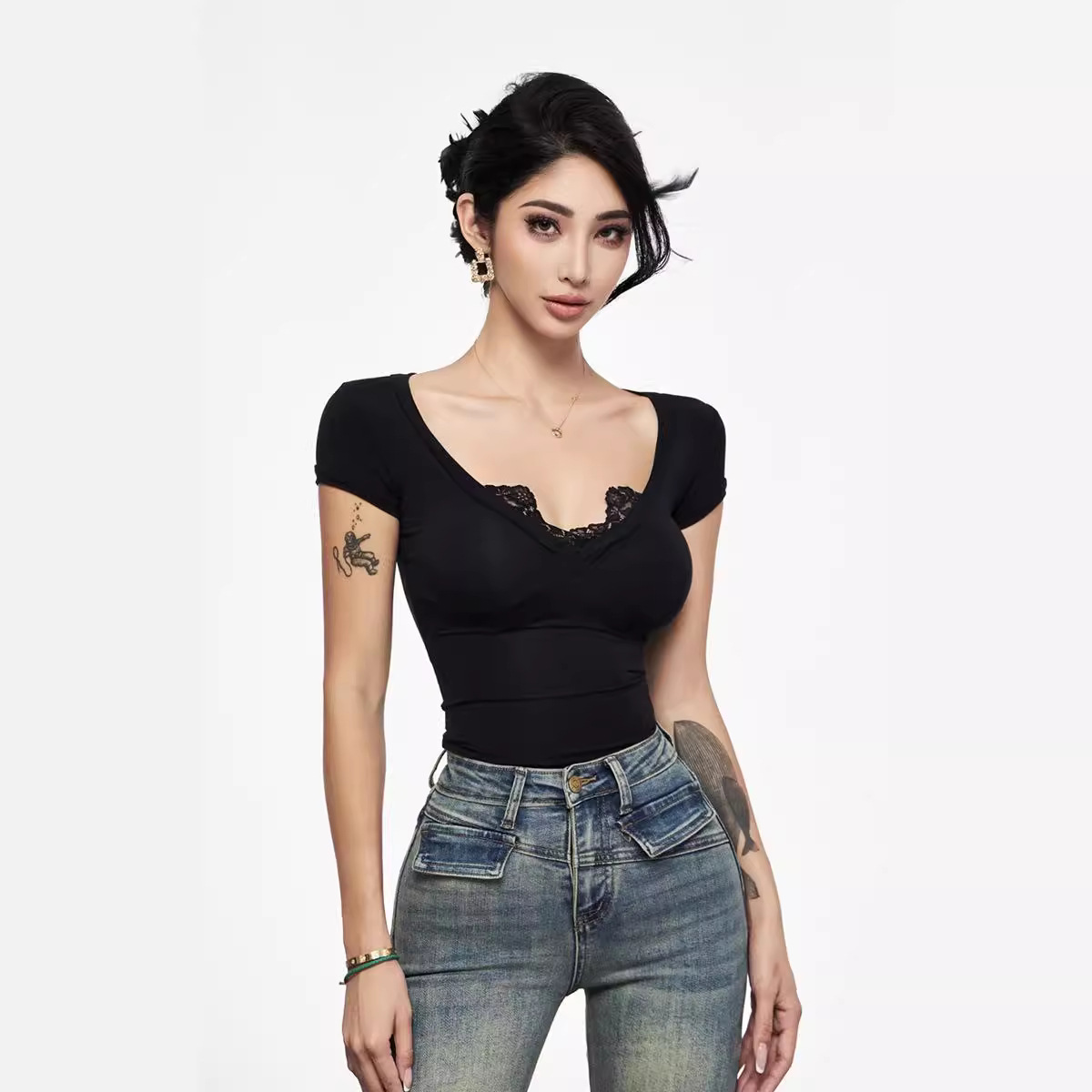 纯欲辣妹蕾丝花边V领正肩短袖T恤女2025夏季纯棉修身百搭短款上衣