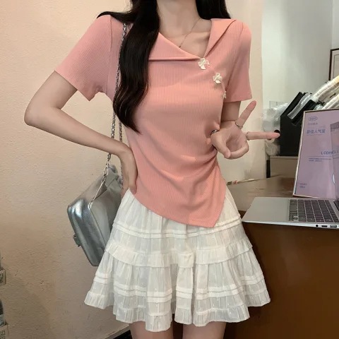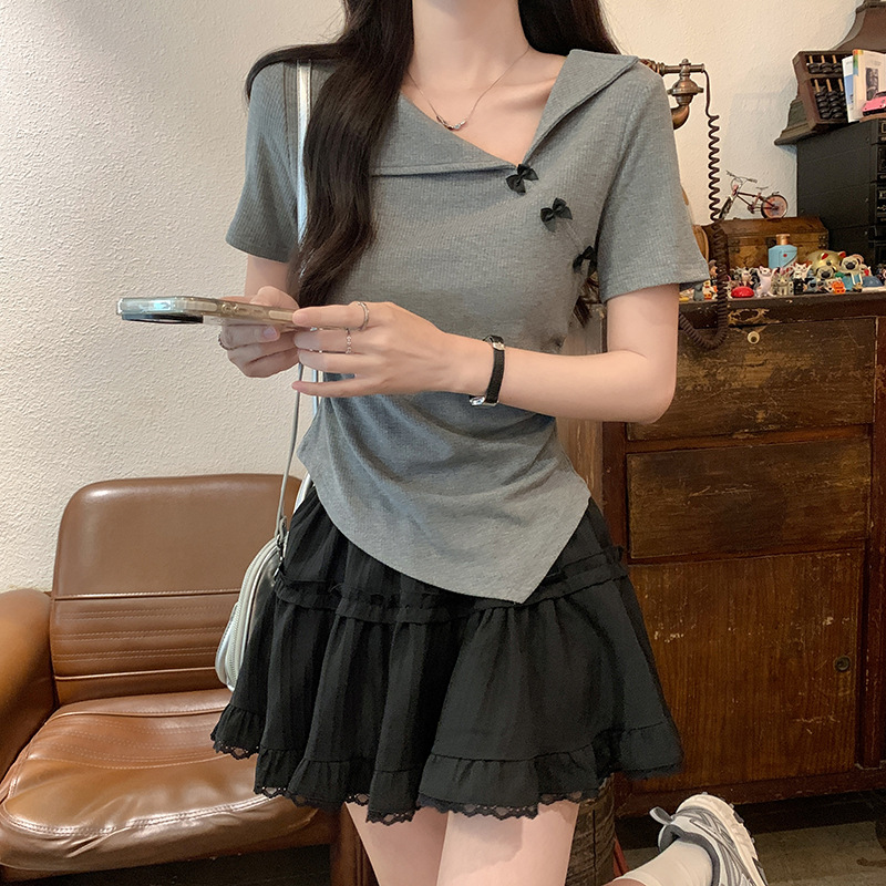 灰色不规则短袖T恤女夏2025新款小众设计感褶皱正肩体恤短款上衣