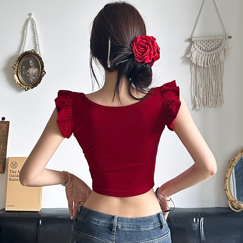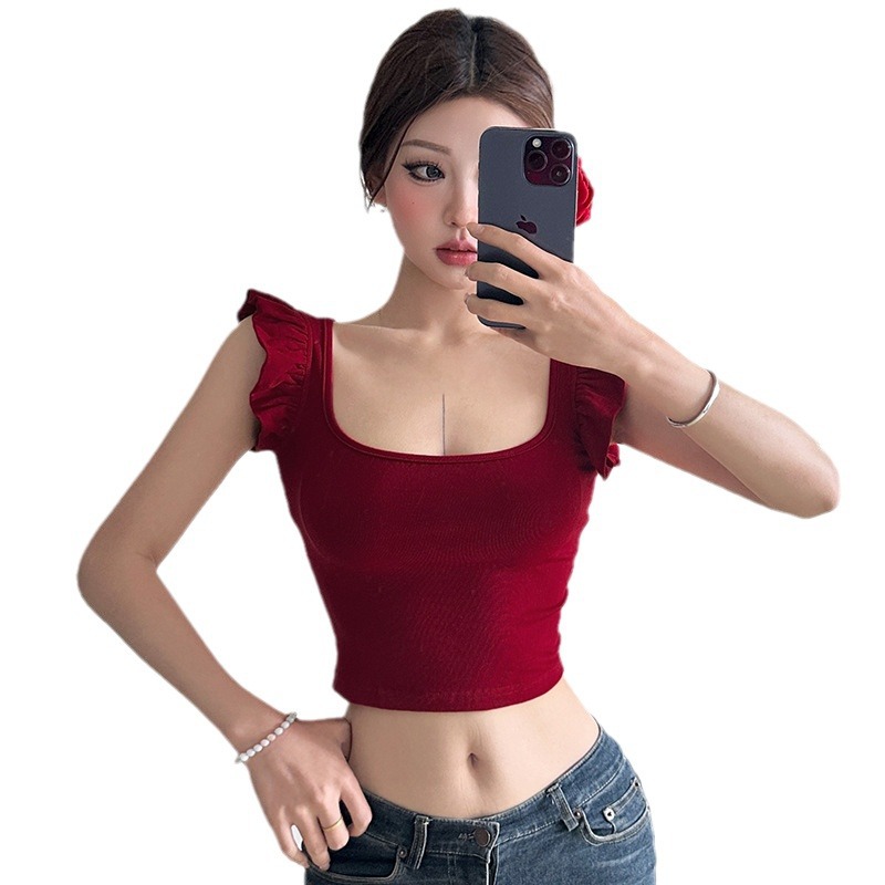 酒红色方领小飞袖修身显瘦T恤2025年夏季新款法式辣妹小众女装潮