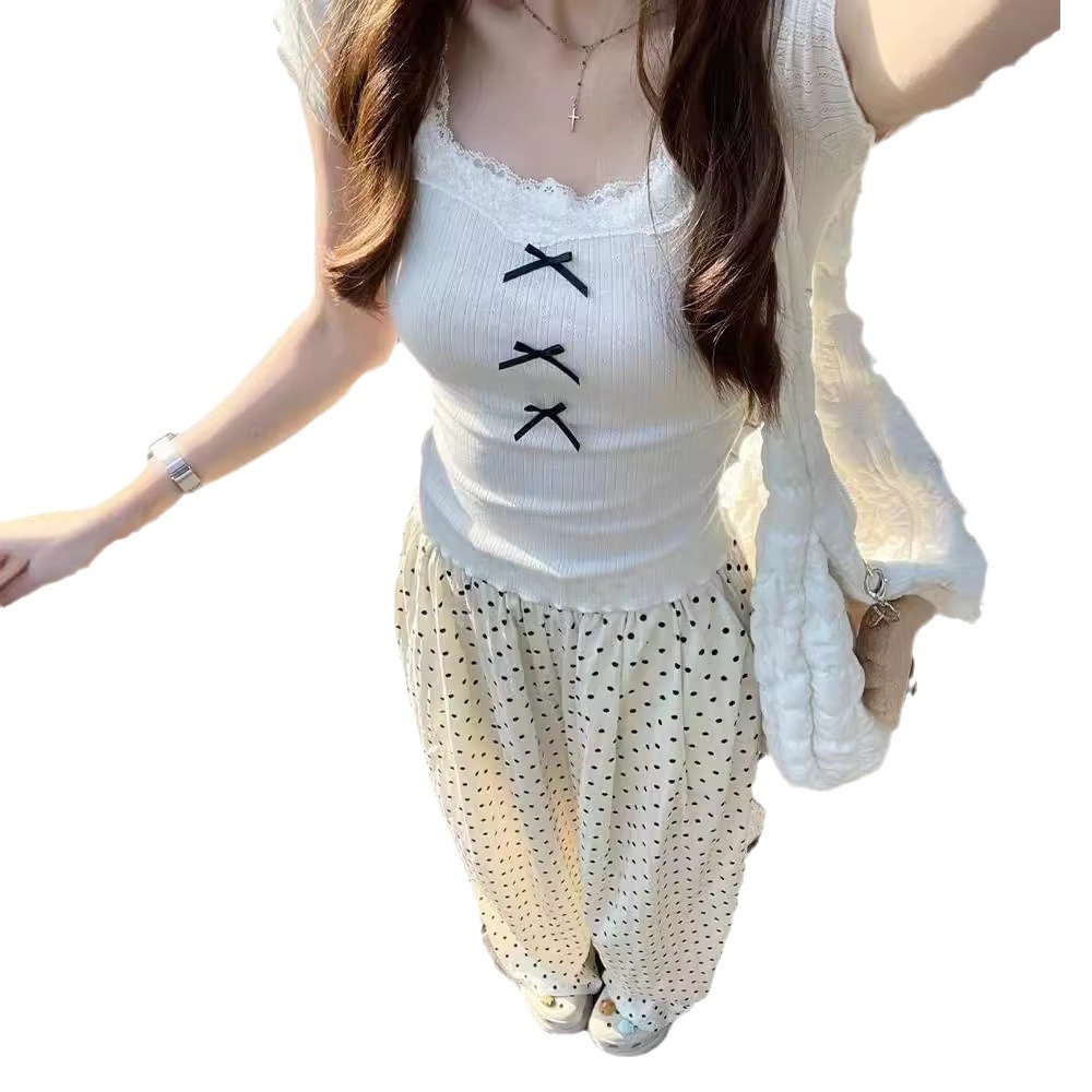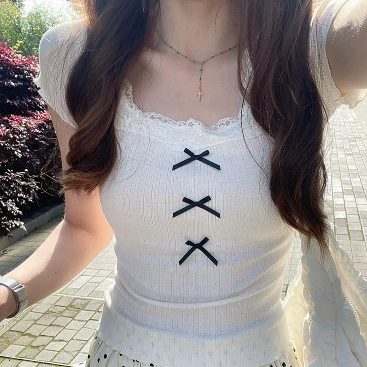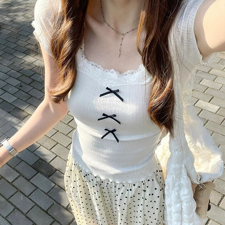 纯欲芭蕾蕾丝边拼接短袖t恤女夏季修身显瘦设计感正肩上衣假两件