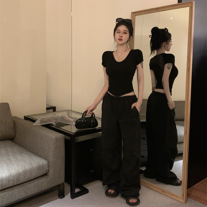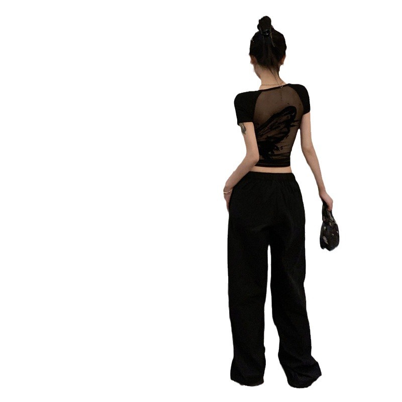 黑色辣妹性感网纱短袖T恤女装夏季新款设计感短款修身别致小上衣