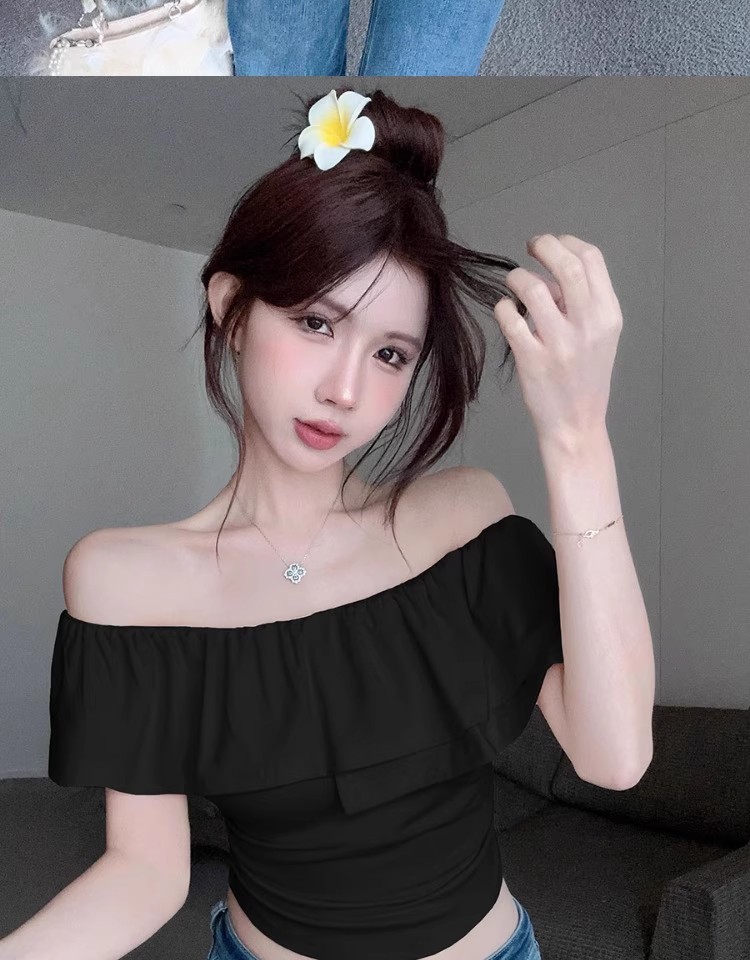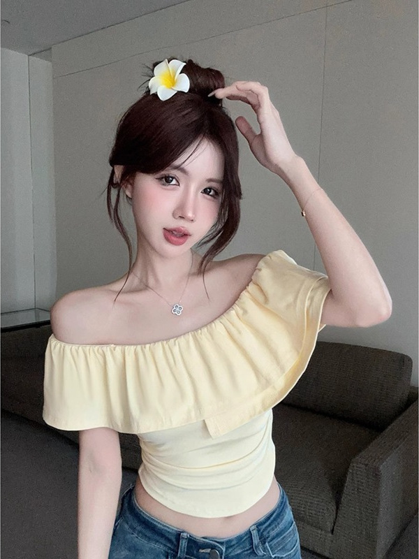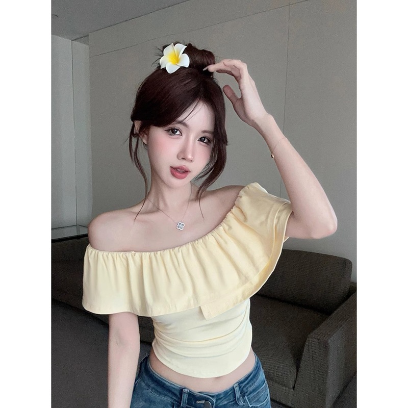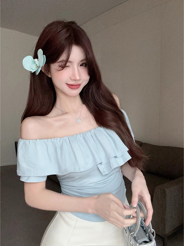 一字肩性感纯欲短袖T恤女夏季修身褶皱荷叶边蓝色短款别致小上衣