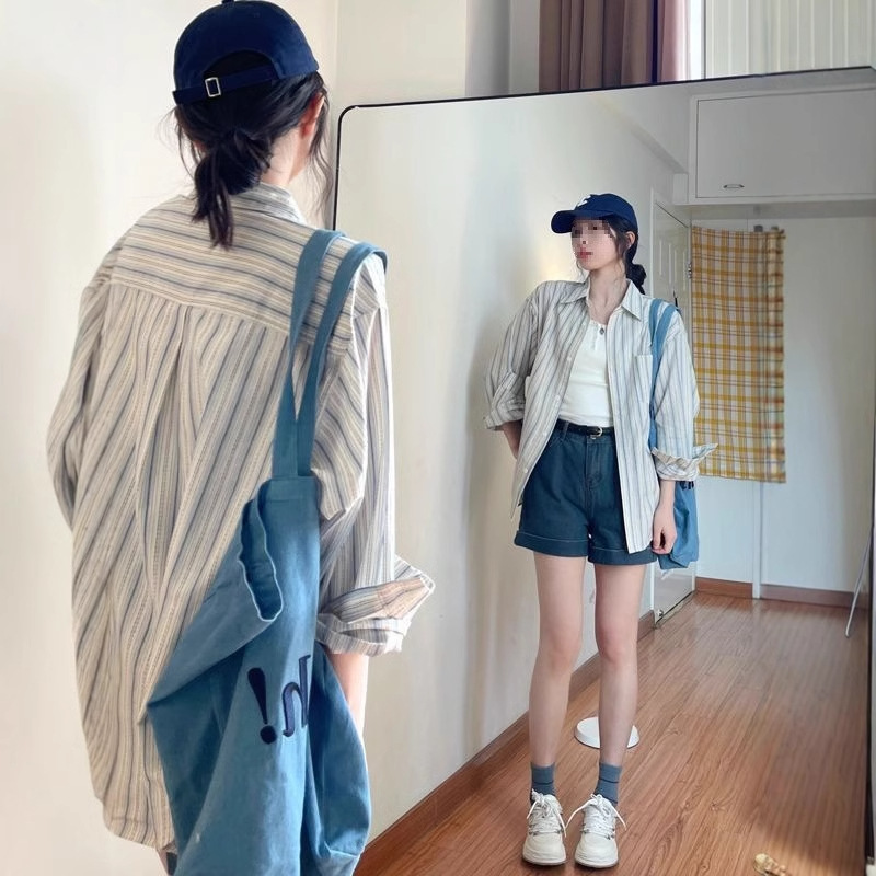长袖衬衫女新款设计感小众蓝色条纹法式上衣夏季防晒衬衣外套