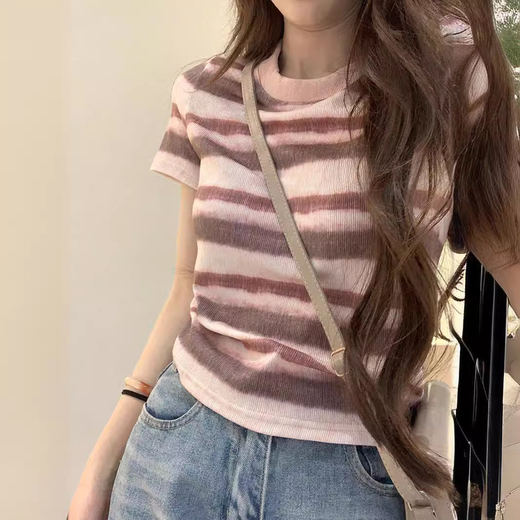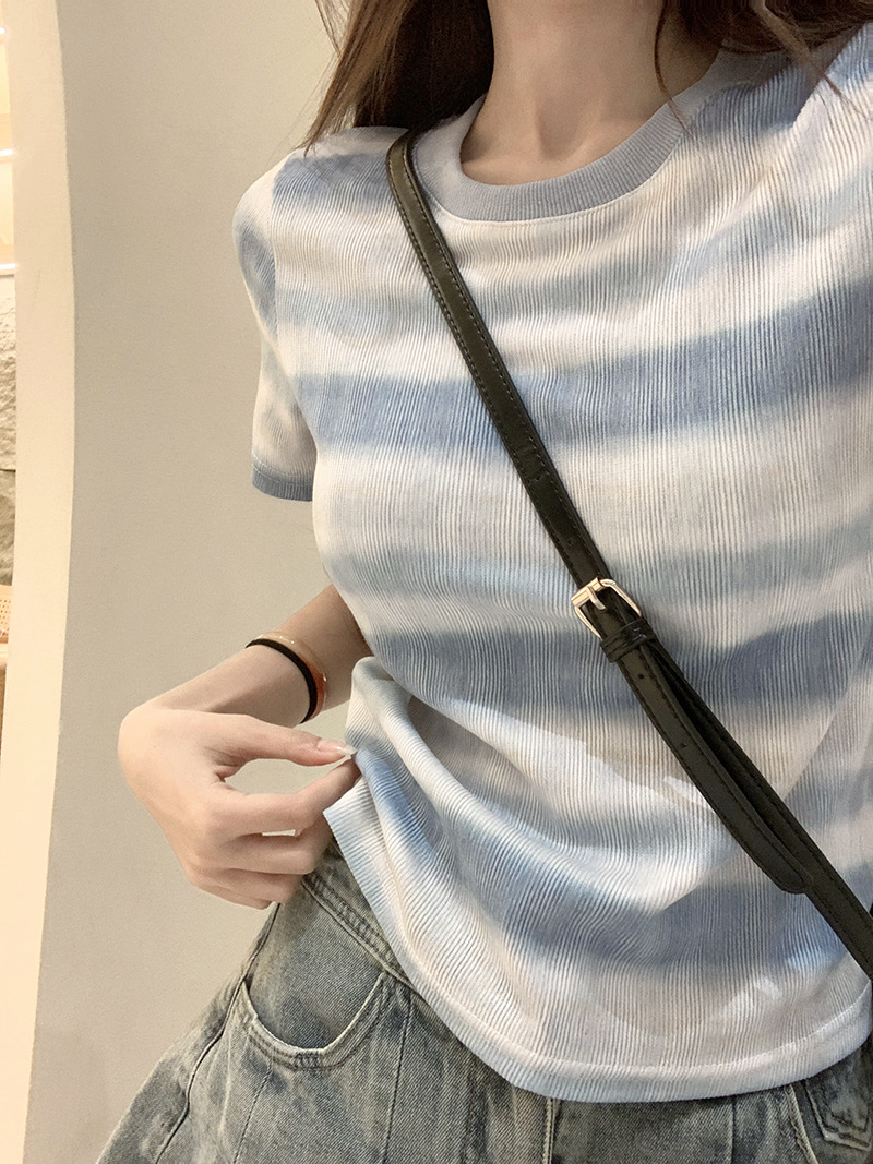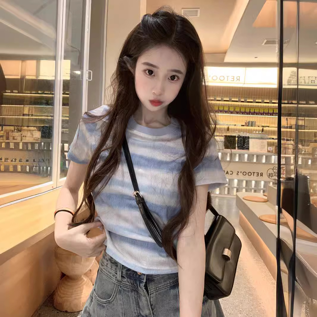 渐变条纹正肩短袖t恤衫女夏季2025新款设计感小众短袖短款上衣