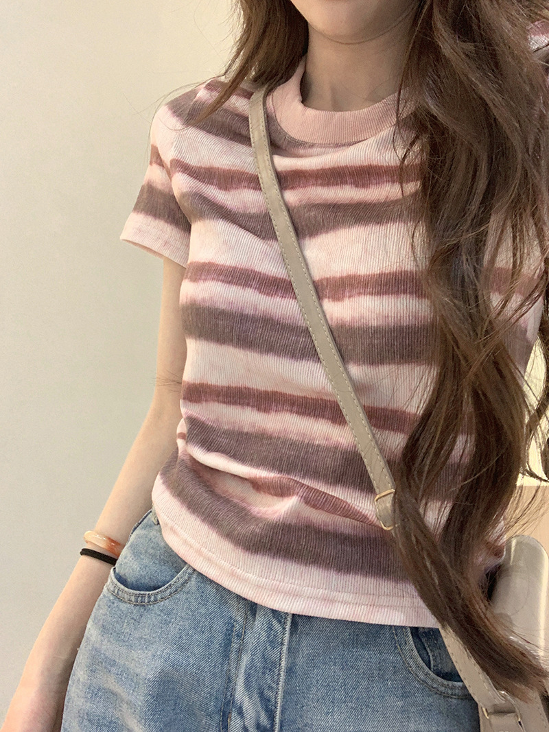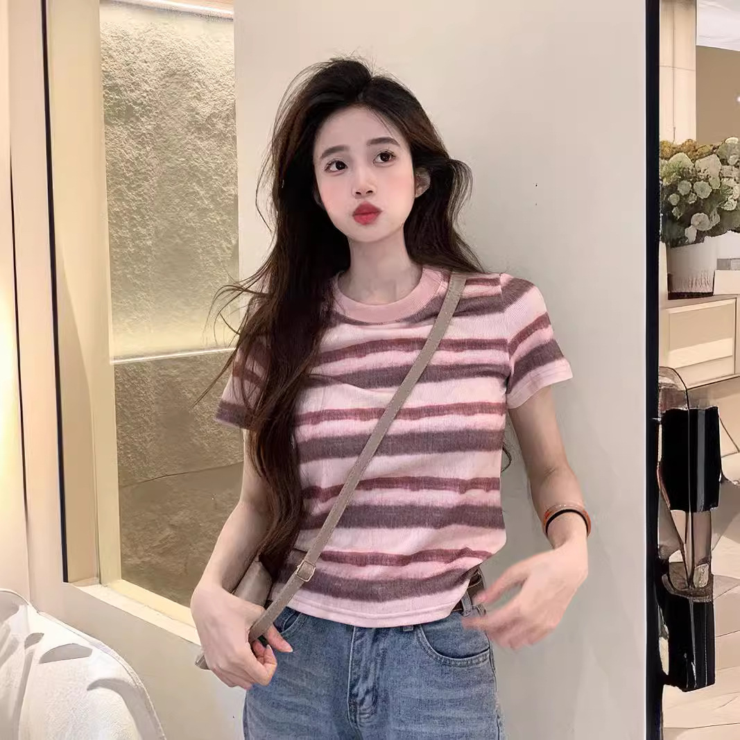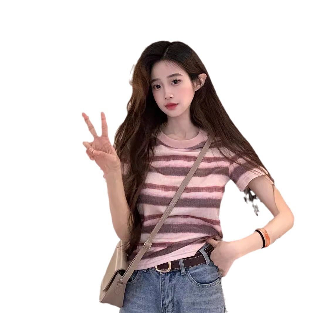 渐变条纹正肩短袖t恤衫女夏季2025新款设计感小众短袖短款上衣