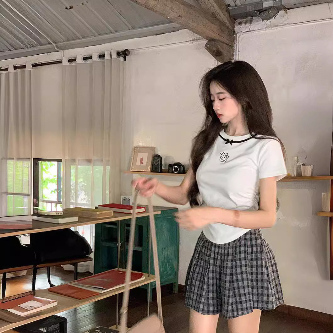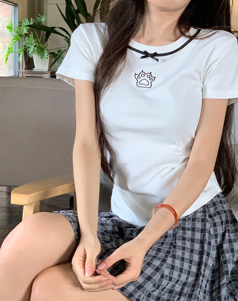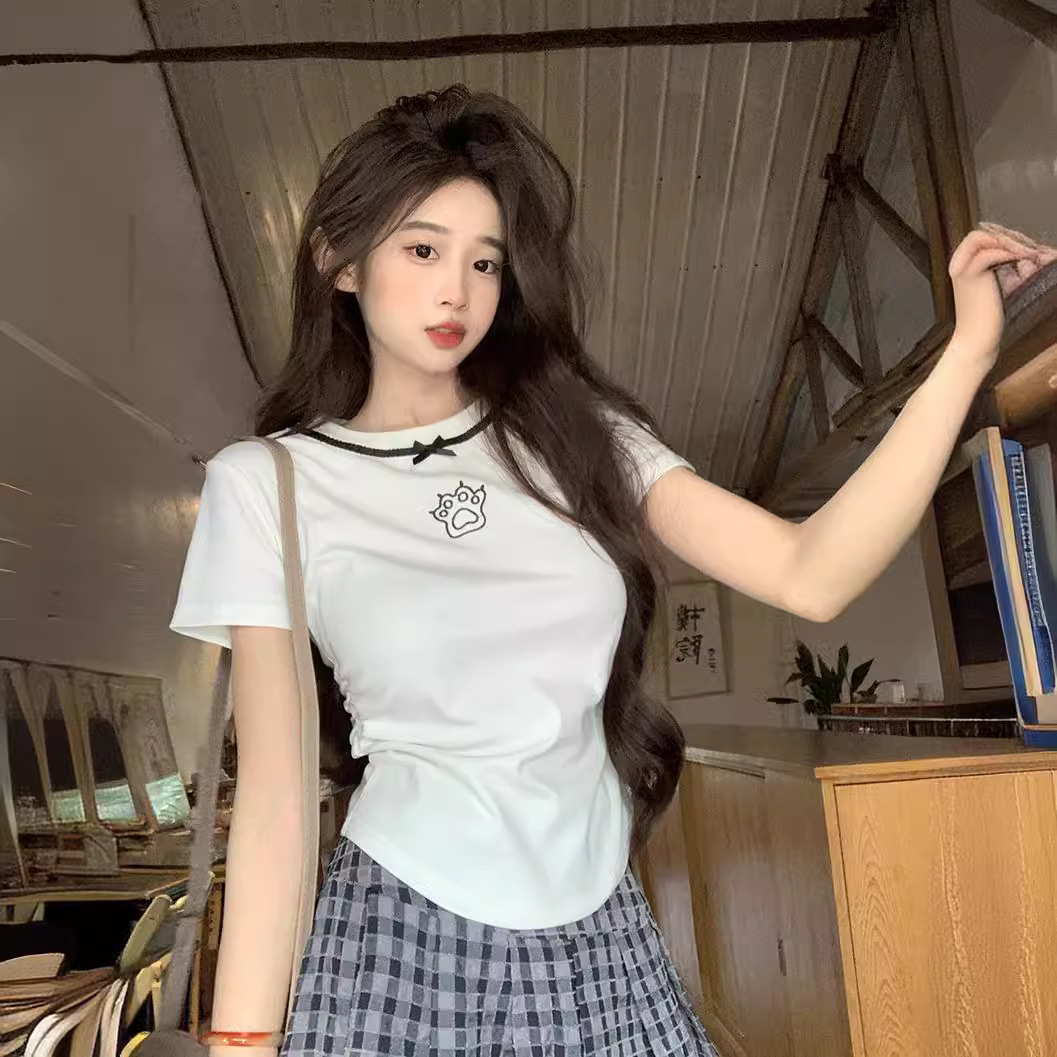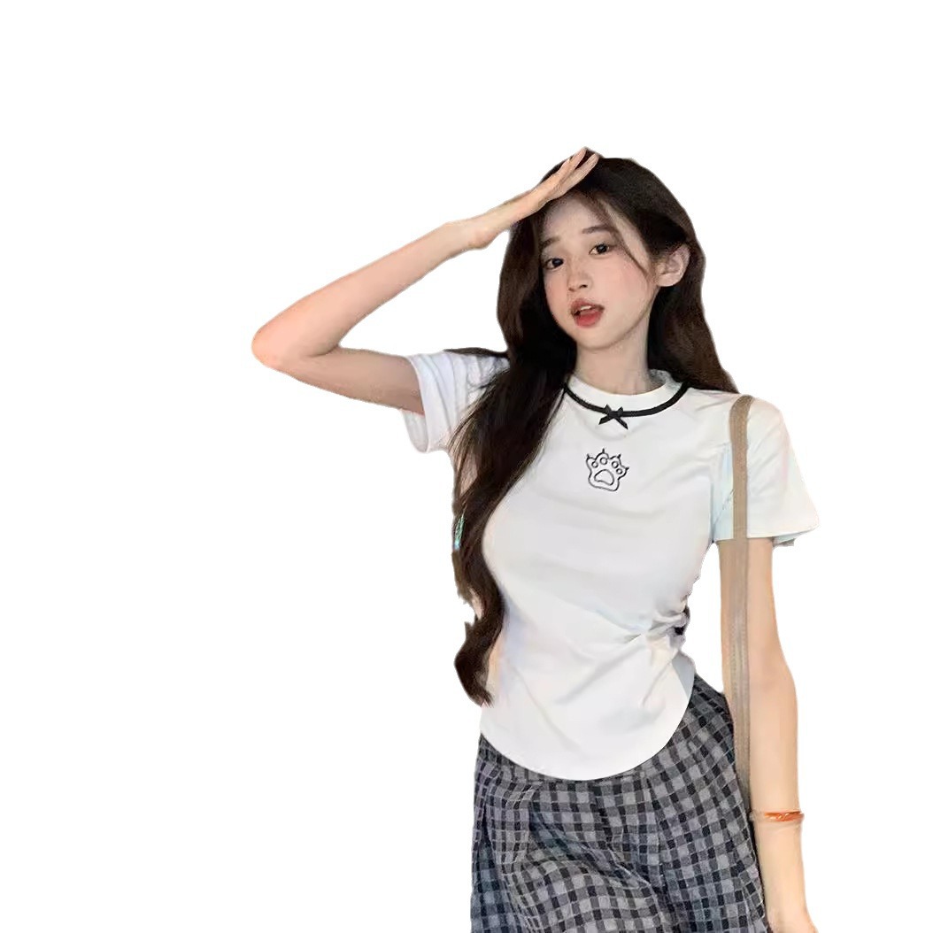 螺纹2025新款短袖t恤女新款纯色设计感猫爪刺绣甜辣妹上衣百搭T恤