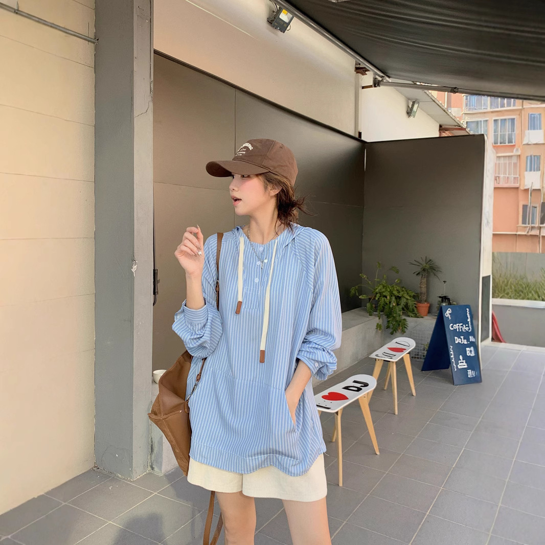 宽松大码女装日系条纹连帽衬衫宽松复古港风休闲长袖外套上衣春秋