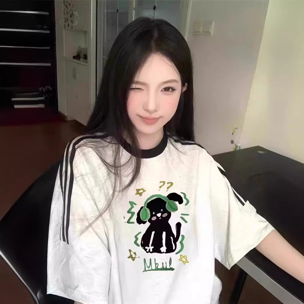 重磅纯棉三条杠短袖t恤女夏季设计感美式宽松大版半袖情侣上衣潮