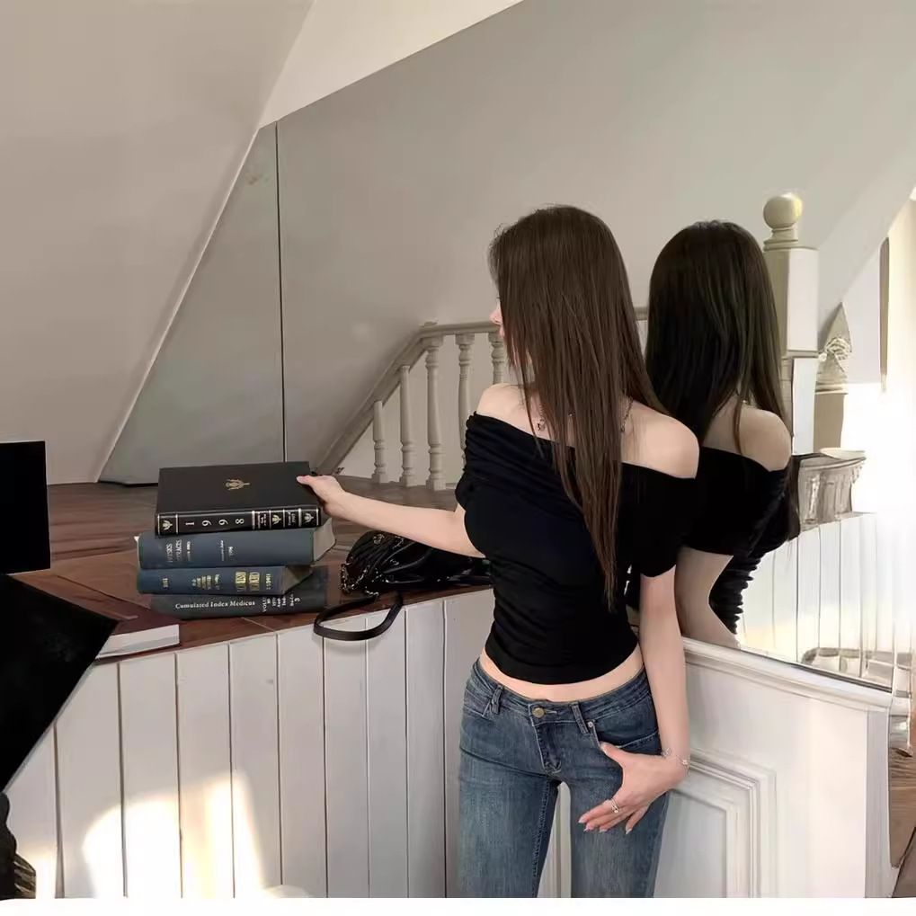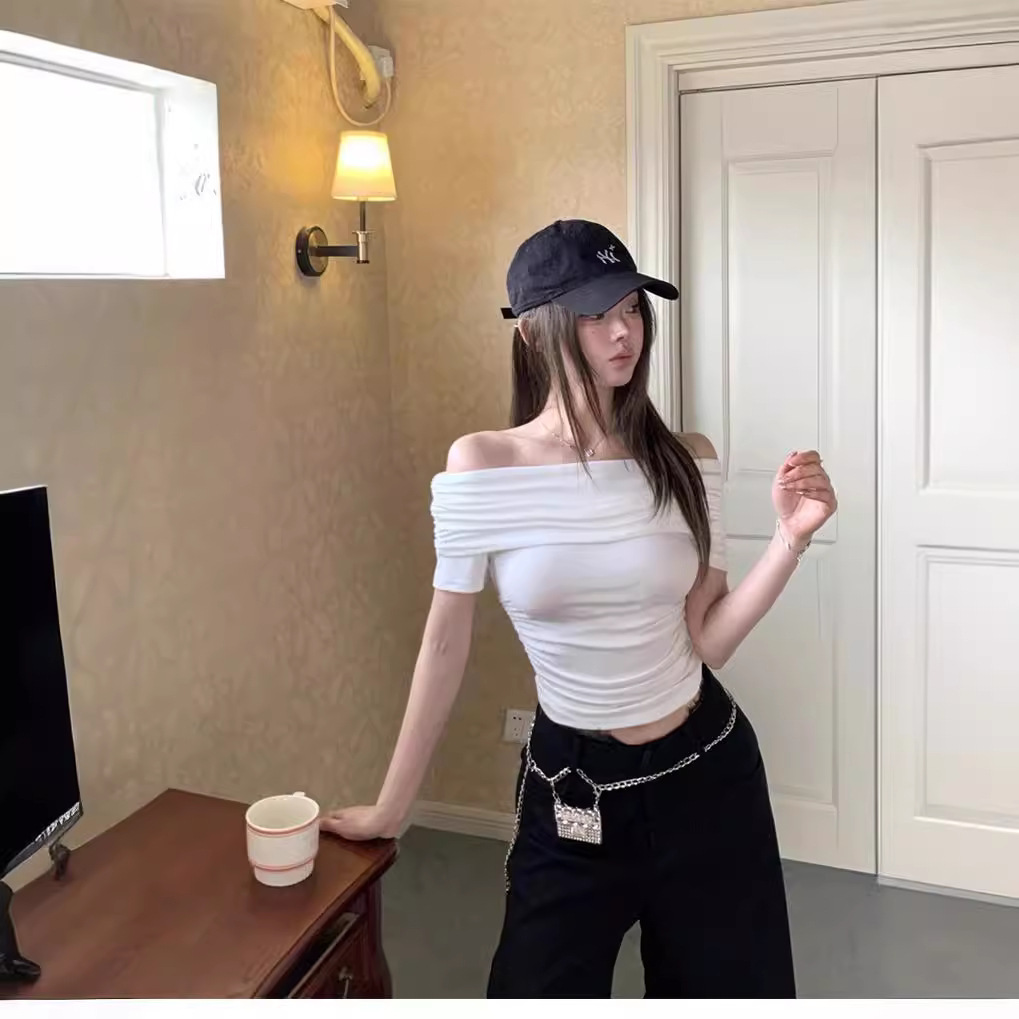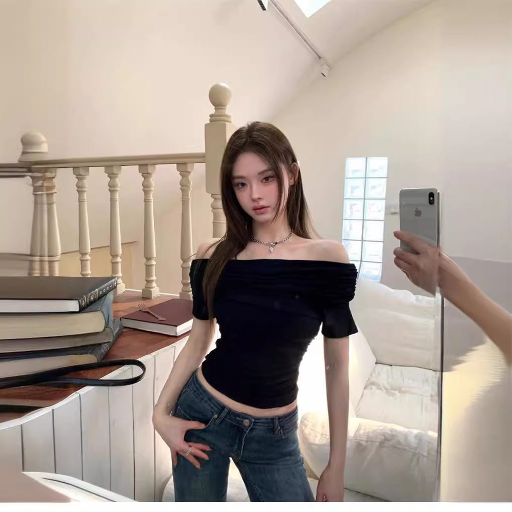 法式修身一字领漏肩短袖T恤女夏季纯欲性感甜辣妹风显瘦小衫欧货