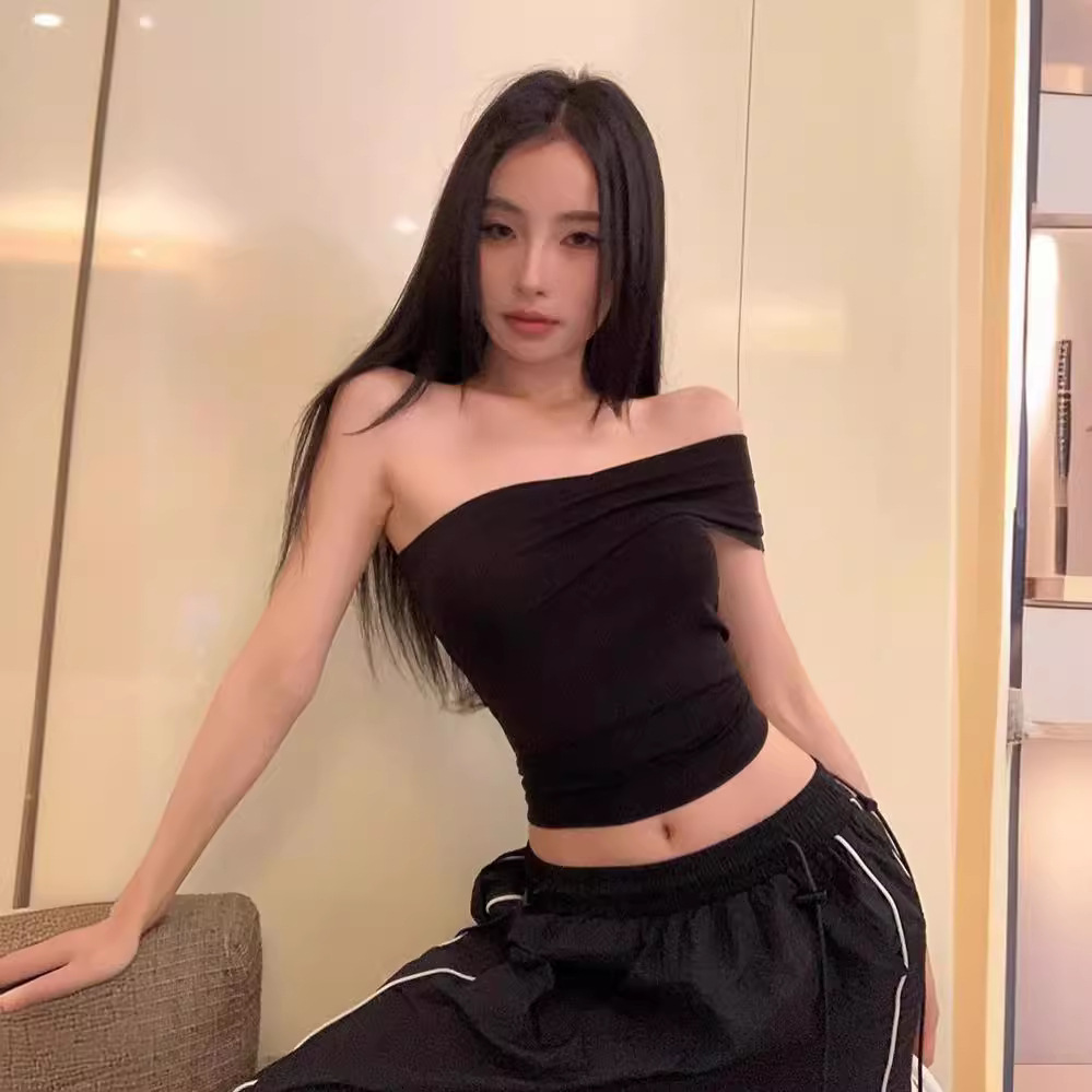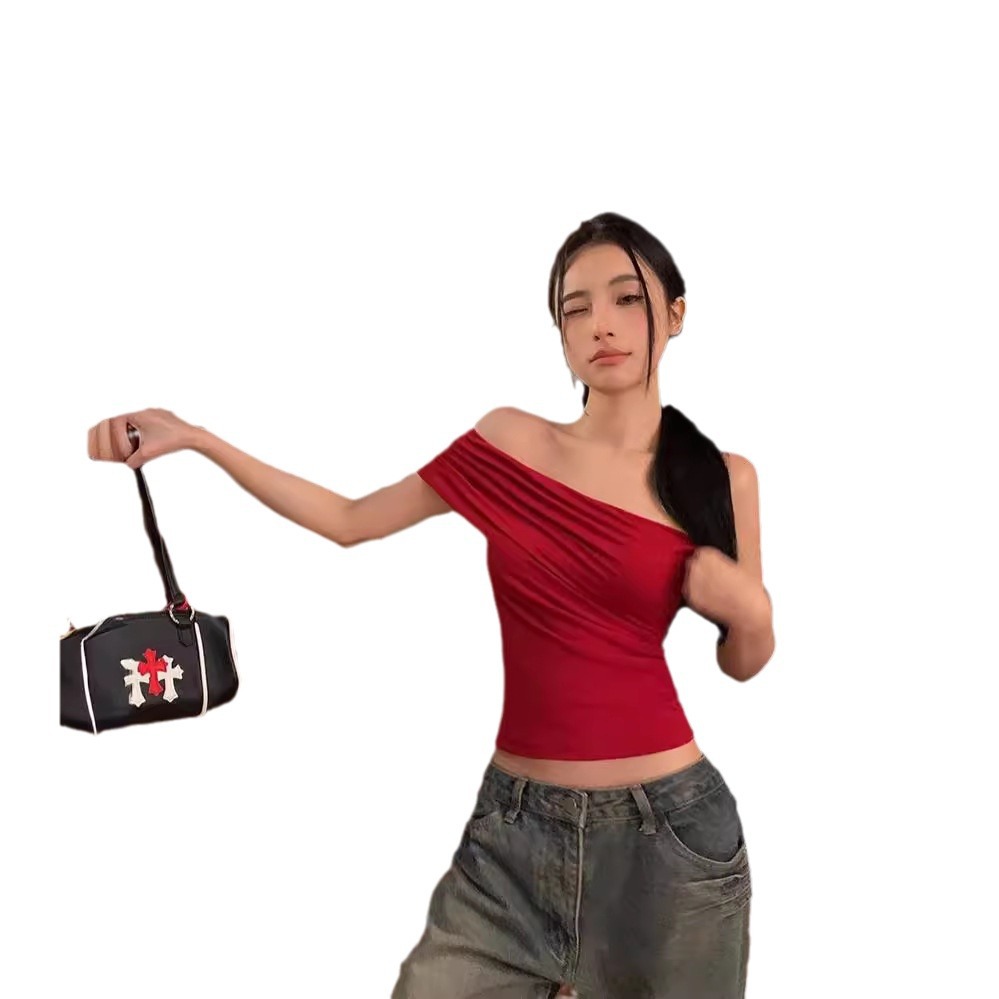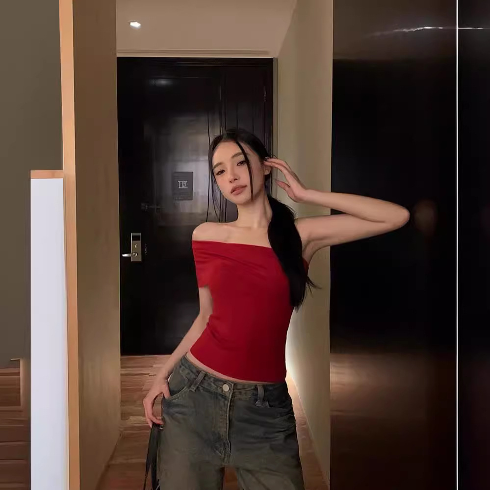 一字肩性感短袖T恤女夏季修身显瘦打底辣妹小众红色短款露背上衣