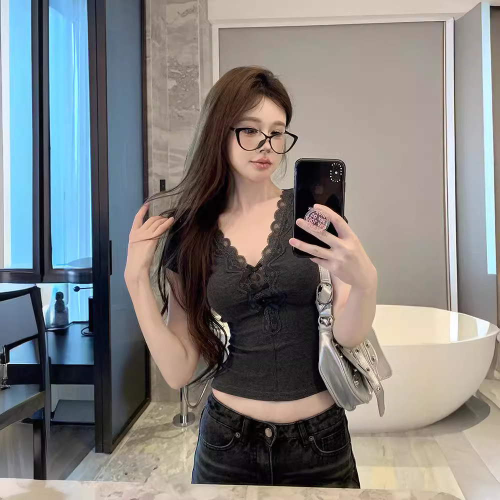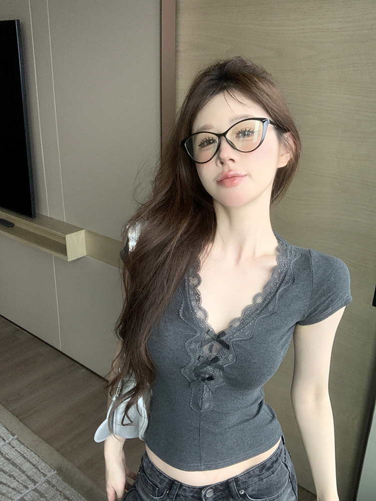 蝴蝶结灰色V领短袖T恤女装夏季修身显瘦辣妹蕾丝拼接小众短款上衣