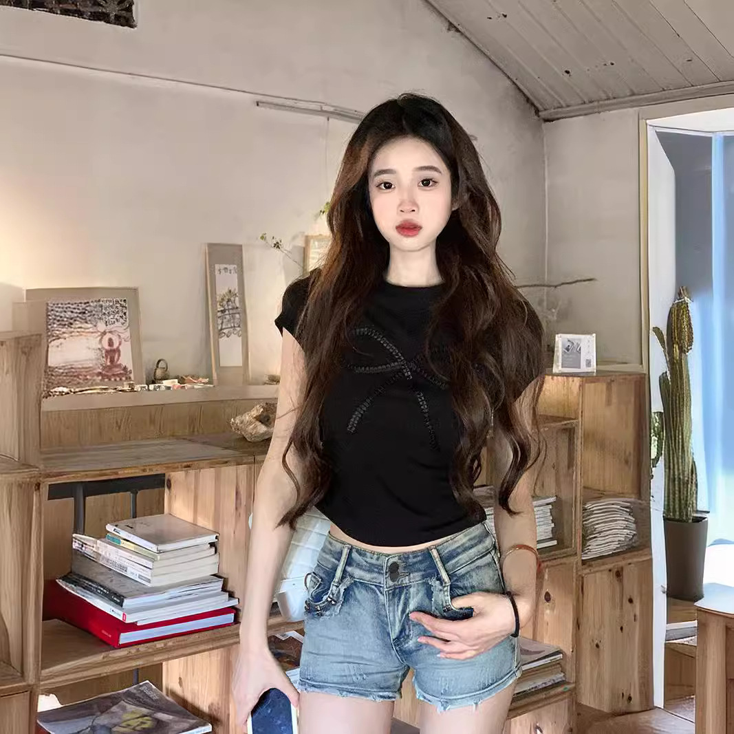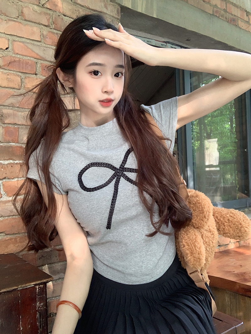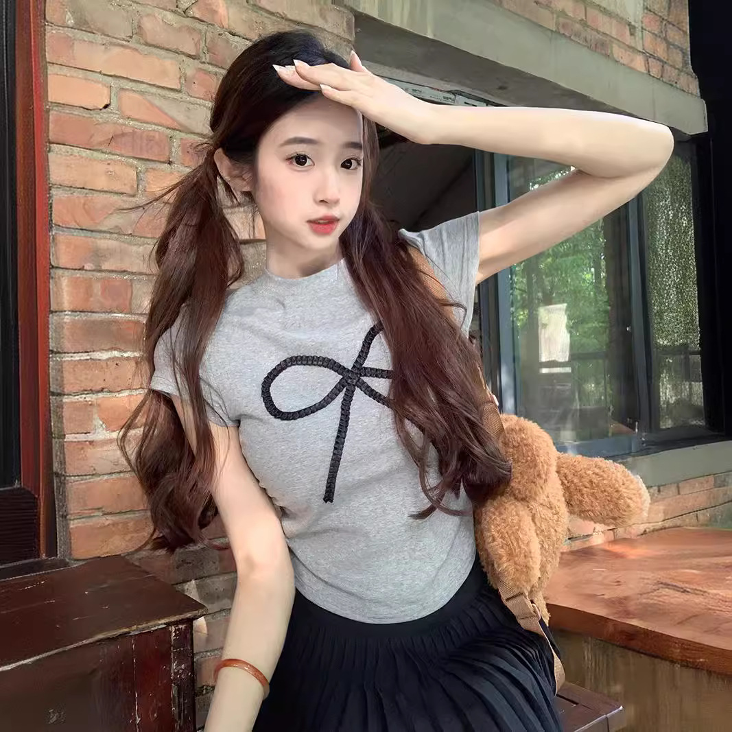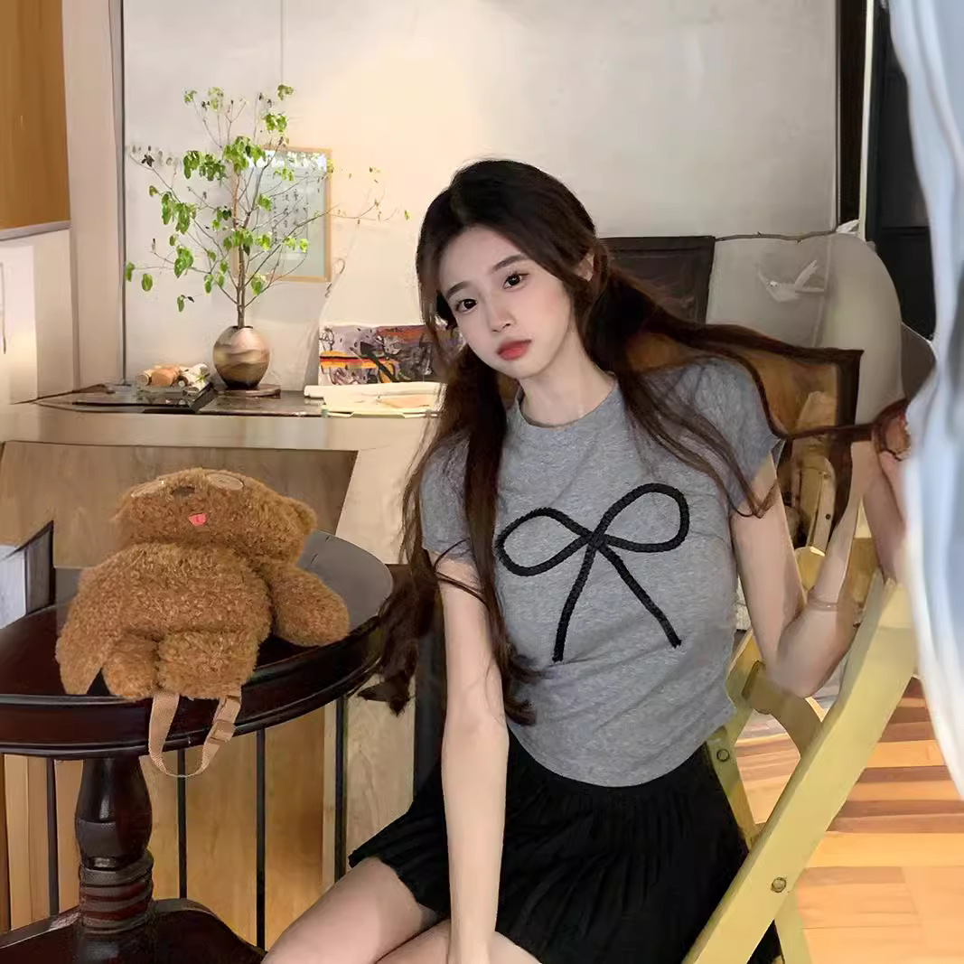 夏季新款小个子甜辣设计感正肩短袖别致t恤女装修身短款蝴蝶结T恤