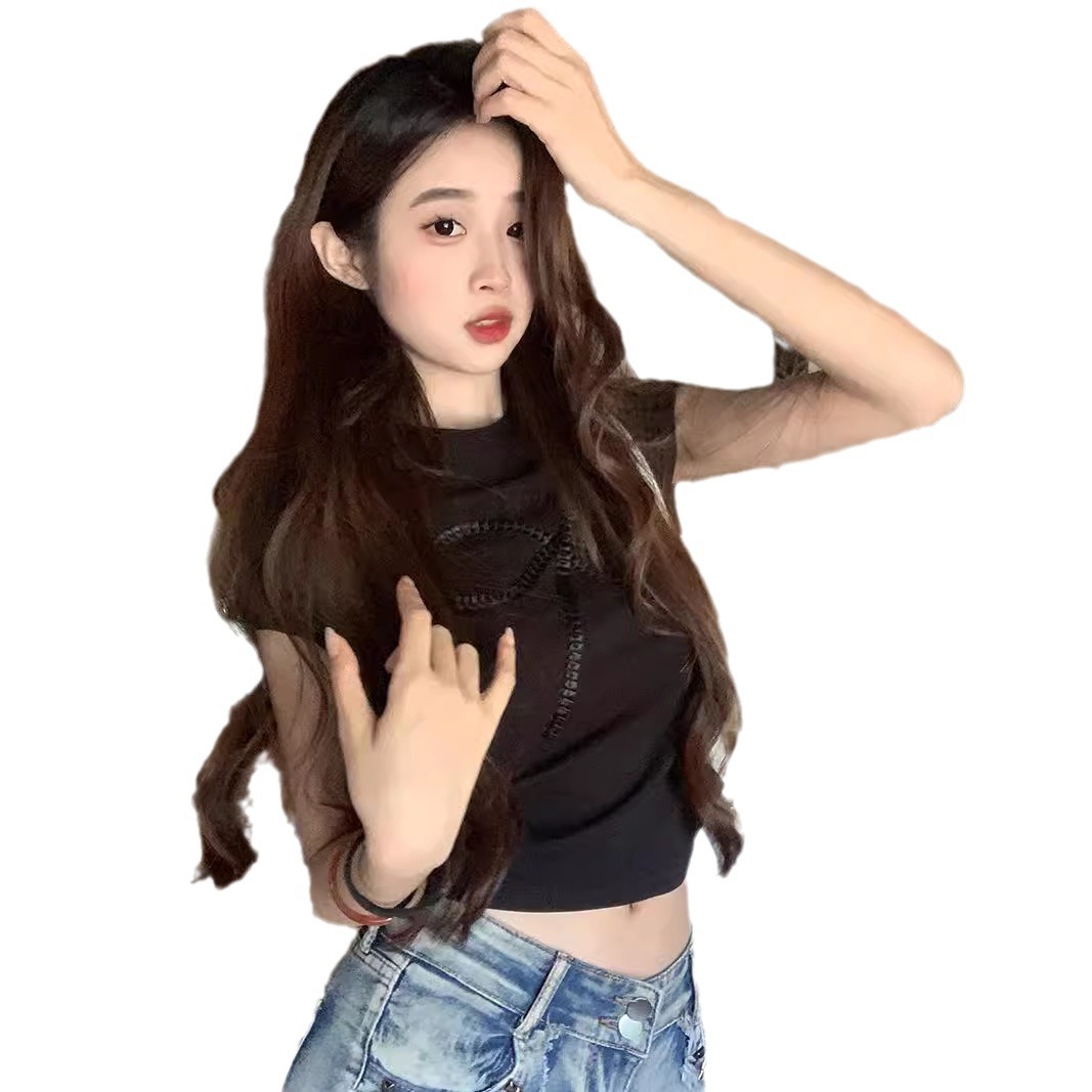 美式甜辣v领短袖t恤女夏季新款洋气高级感垫肩短款上衣体恤女