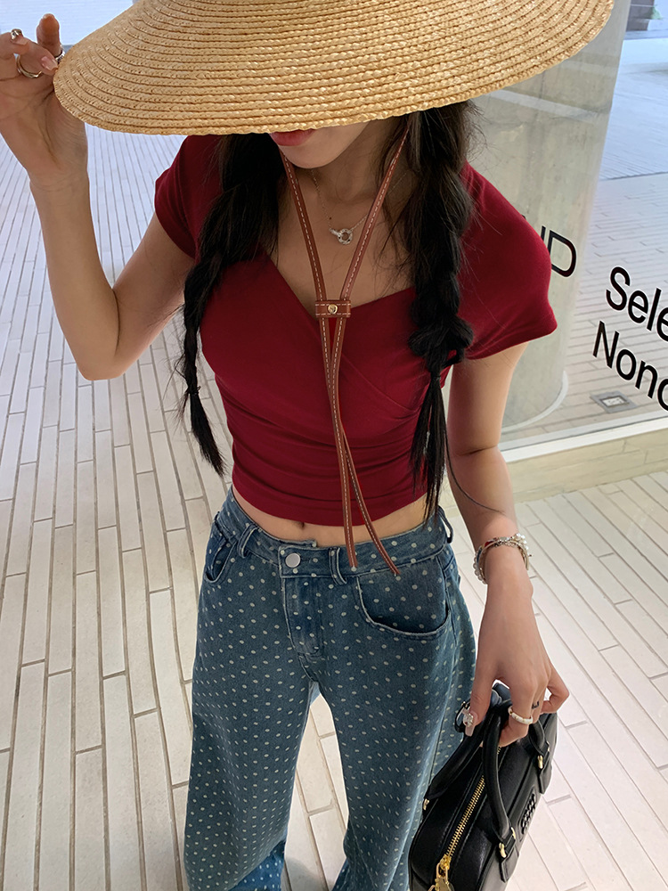 修身V领短款露脐甜辣纯欲风正肩短袖t恤女2025新款爆款上衣女欧货