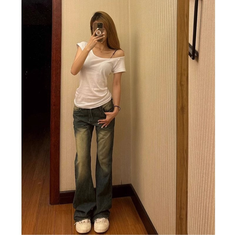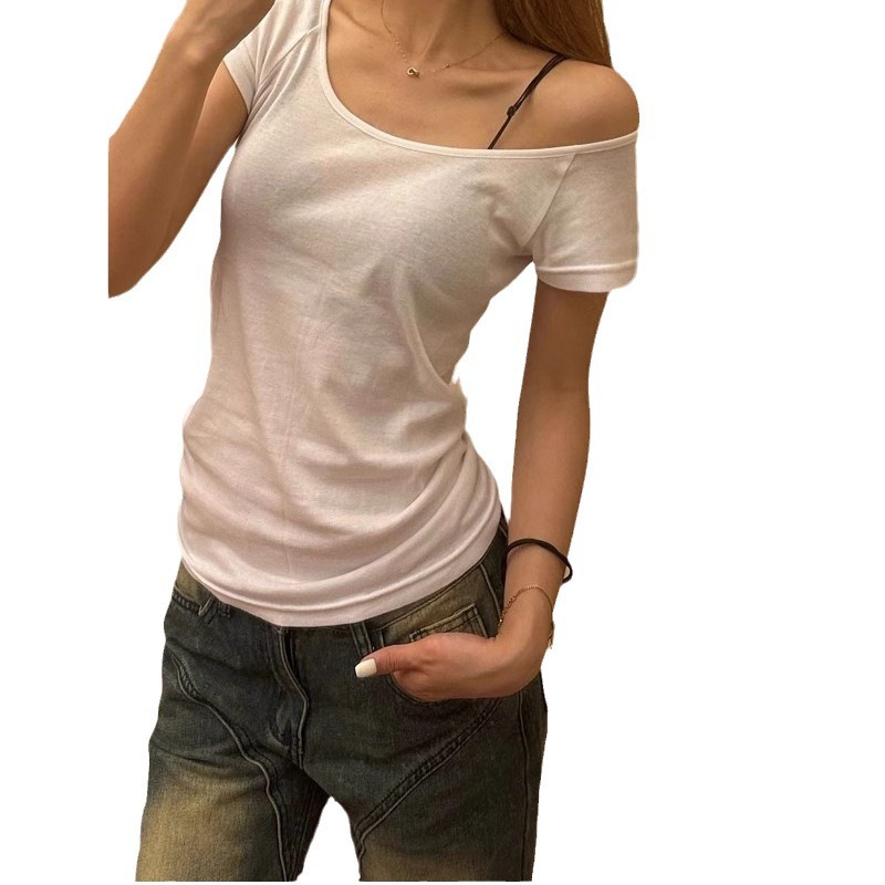 白色一字肩纯棉短袖t恤女夏季设计感小众美式修身短款辣妹上衣