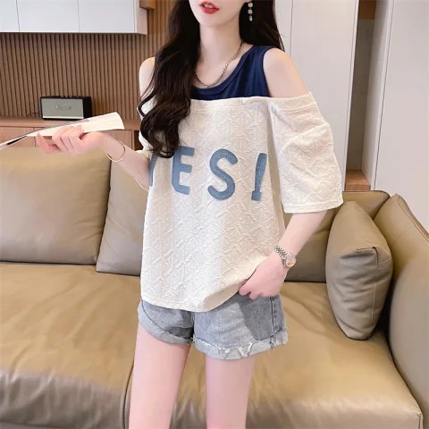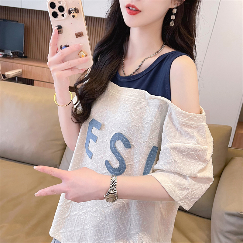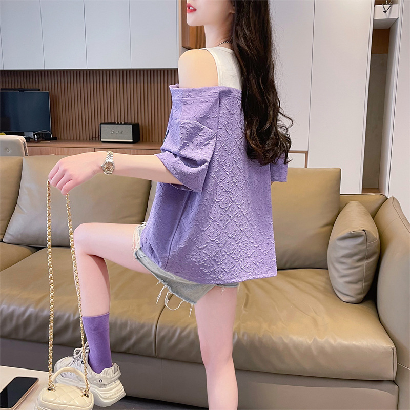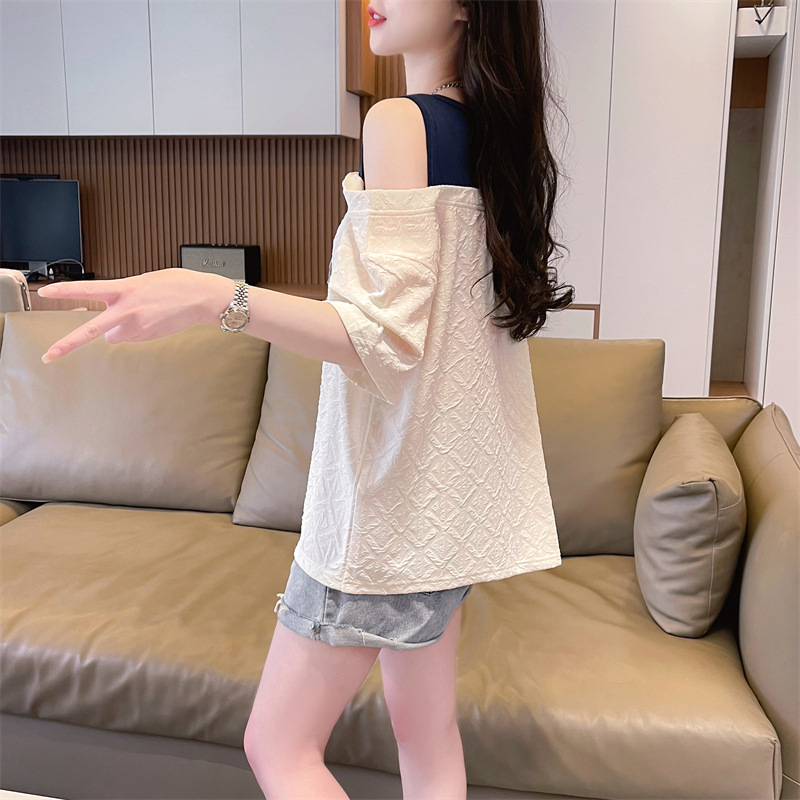 假两件拼接短袖t恤女夏季2025新款宽松大码女装漏肩设计感上衣服