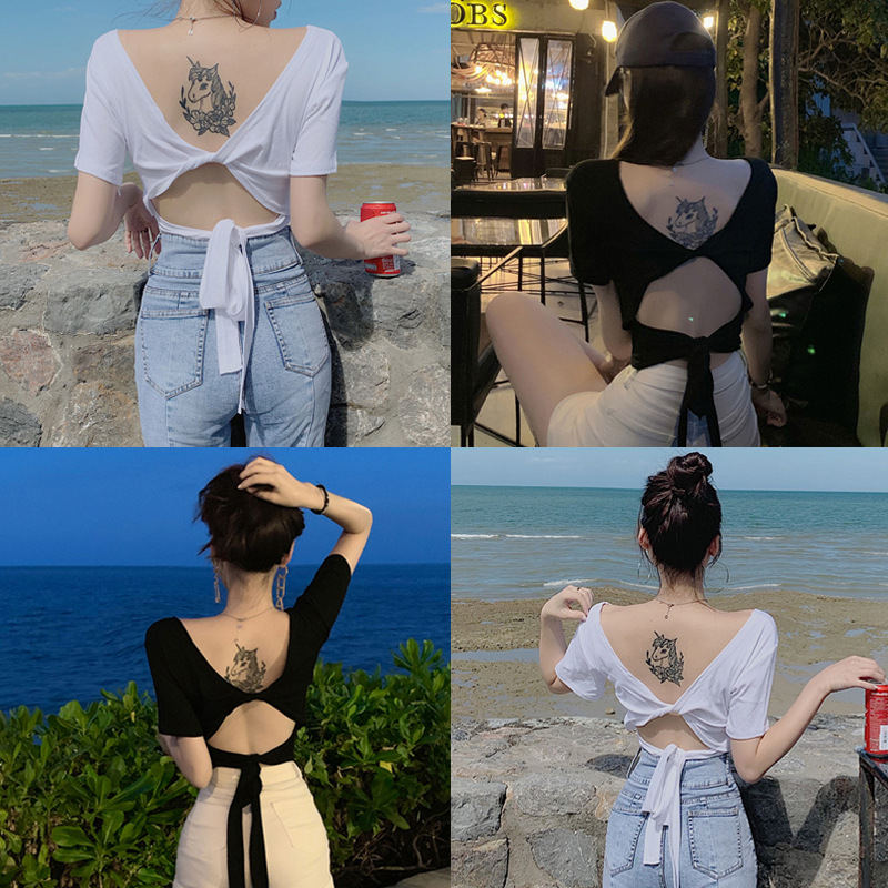 夏季ins漏肩一字肩露背绑带上衣短款露脐紧身性感短袖T恤女潮