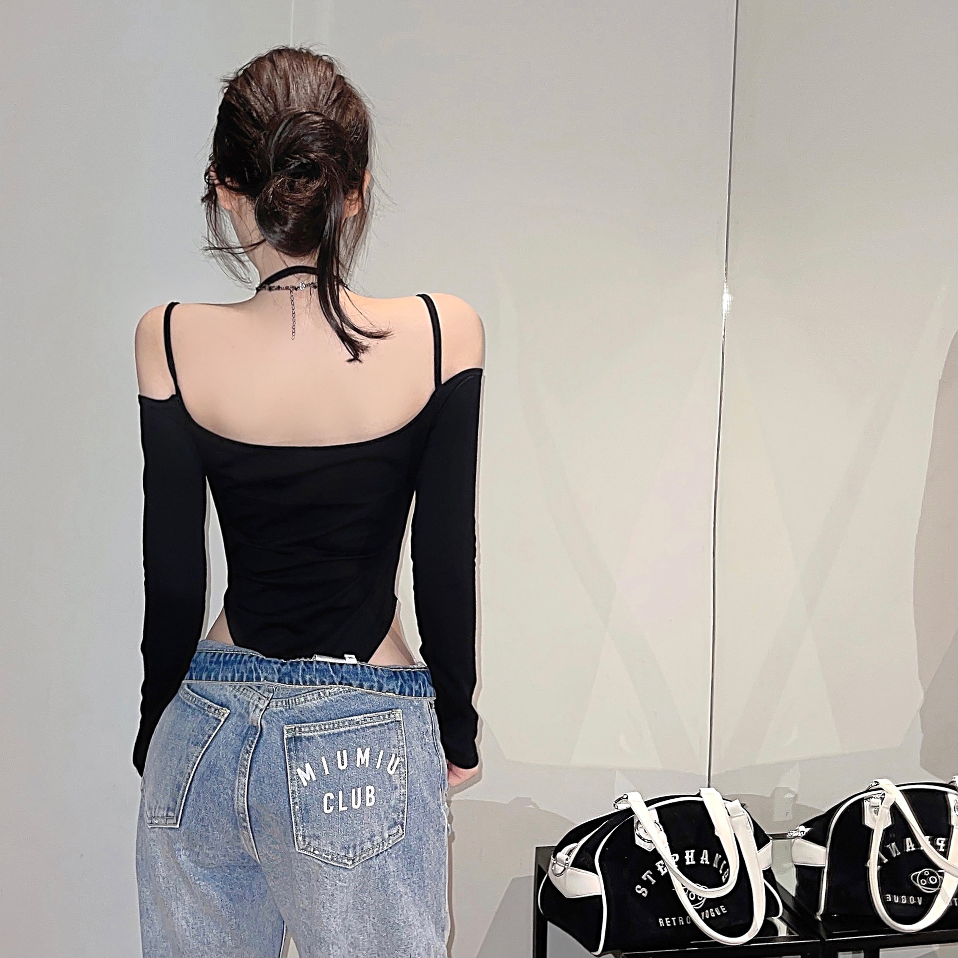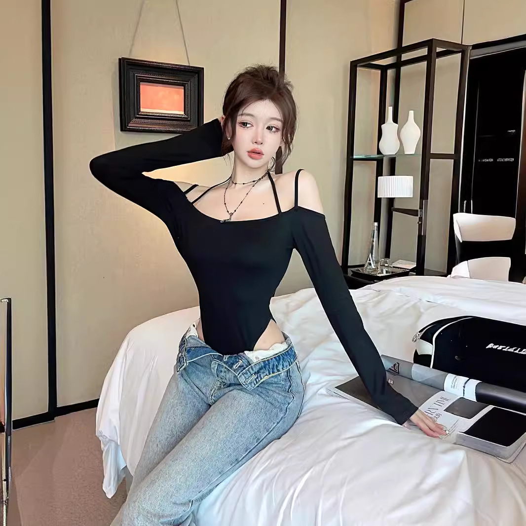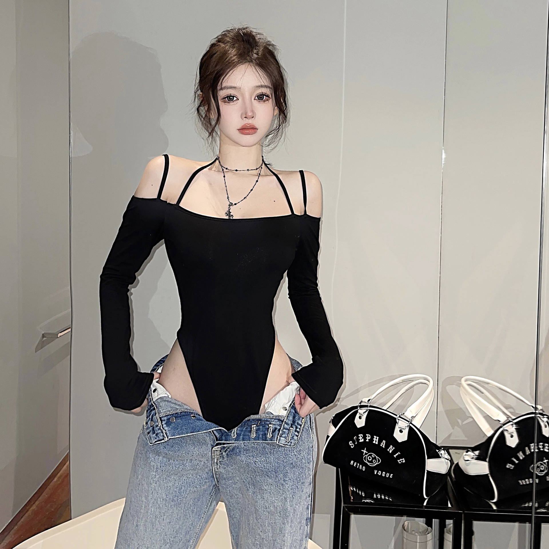 人棉欧货吊带露背辣妹黑色长袖吊带连体衣T恤女早秋露肩性感上衣