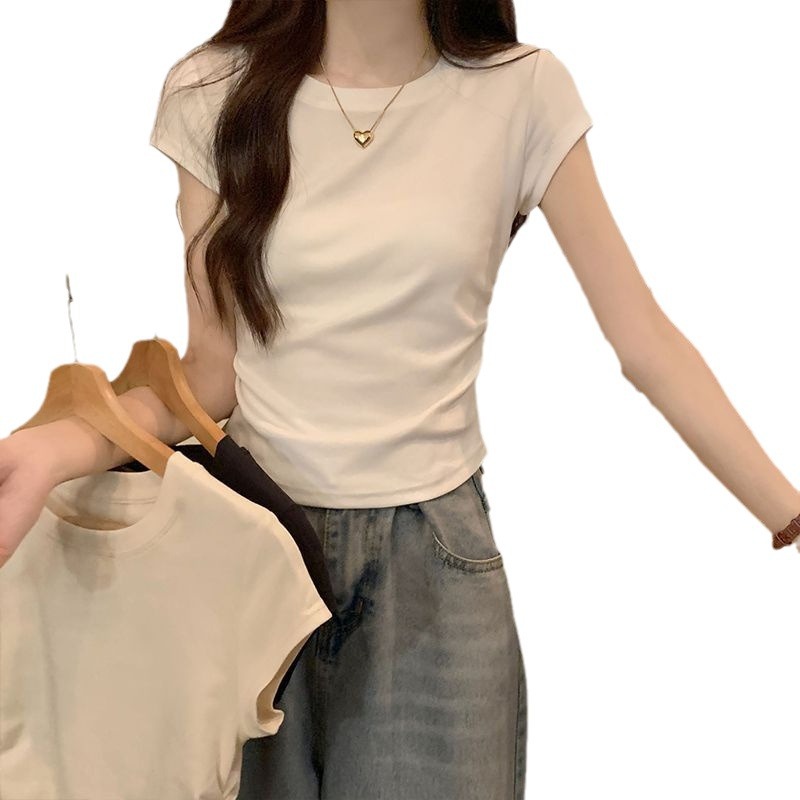 正肩修身显瘦高腰夏季薄款短袖t恤女设计感小众抽褶收腰短款上衣