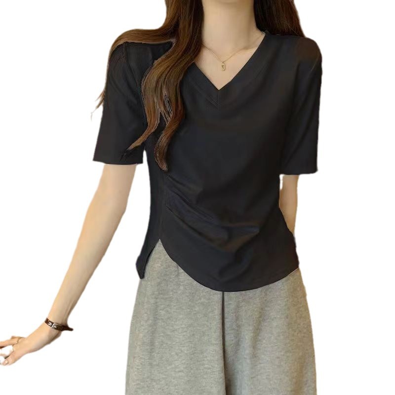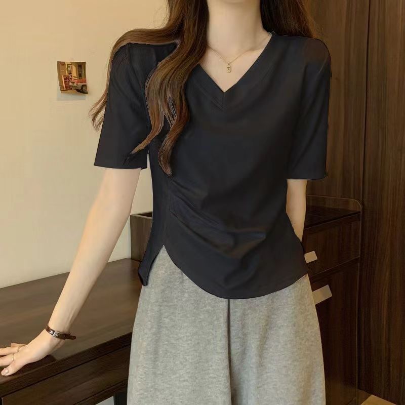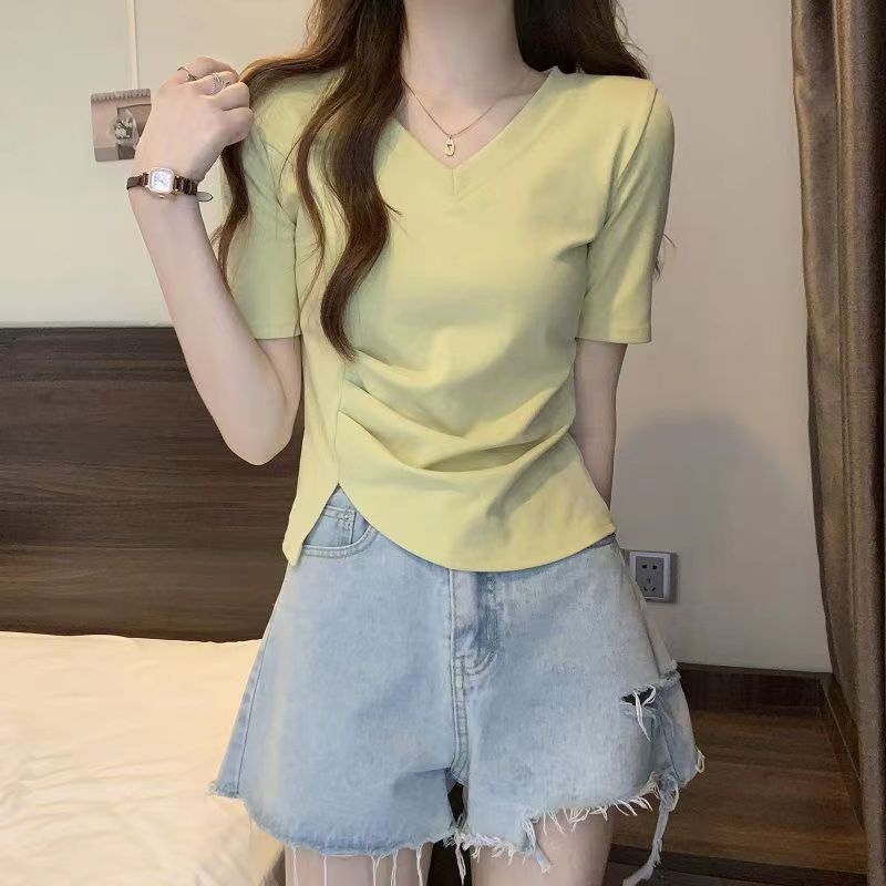 纯棉夏季2025新款V领修身短款辣妹正肩t恤女设计感小众小个子上衣