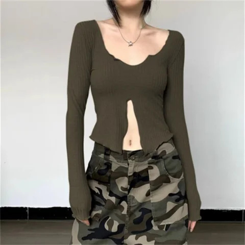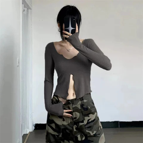 春秋新款气质不规则长袖T恤女木耳边纯色露脐辣妹修身型百搭上衣