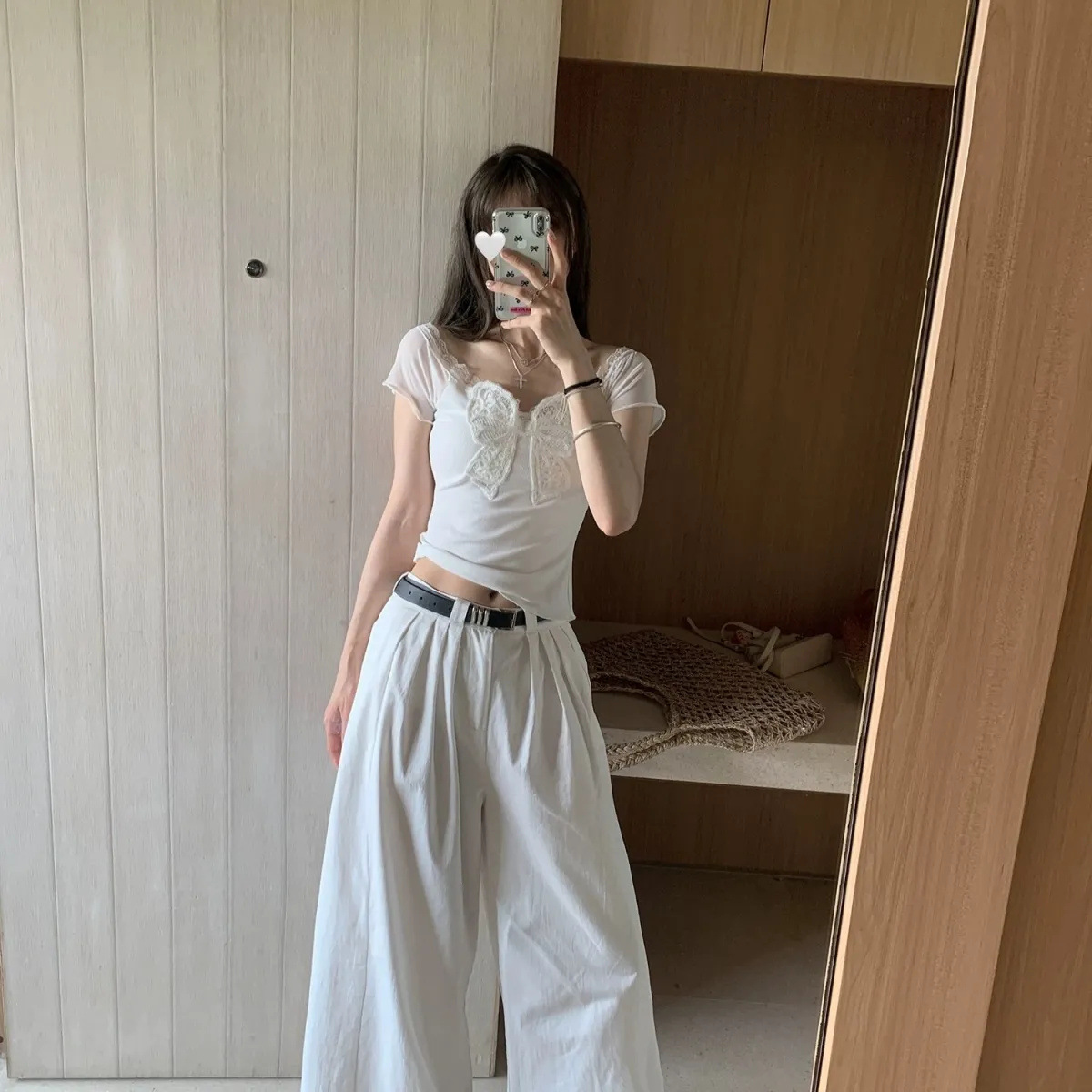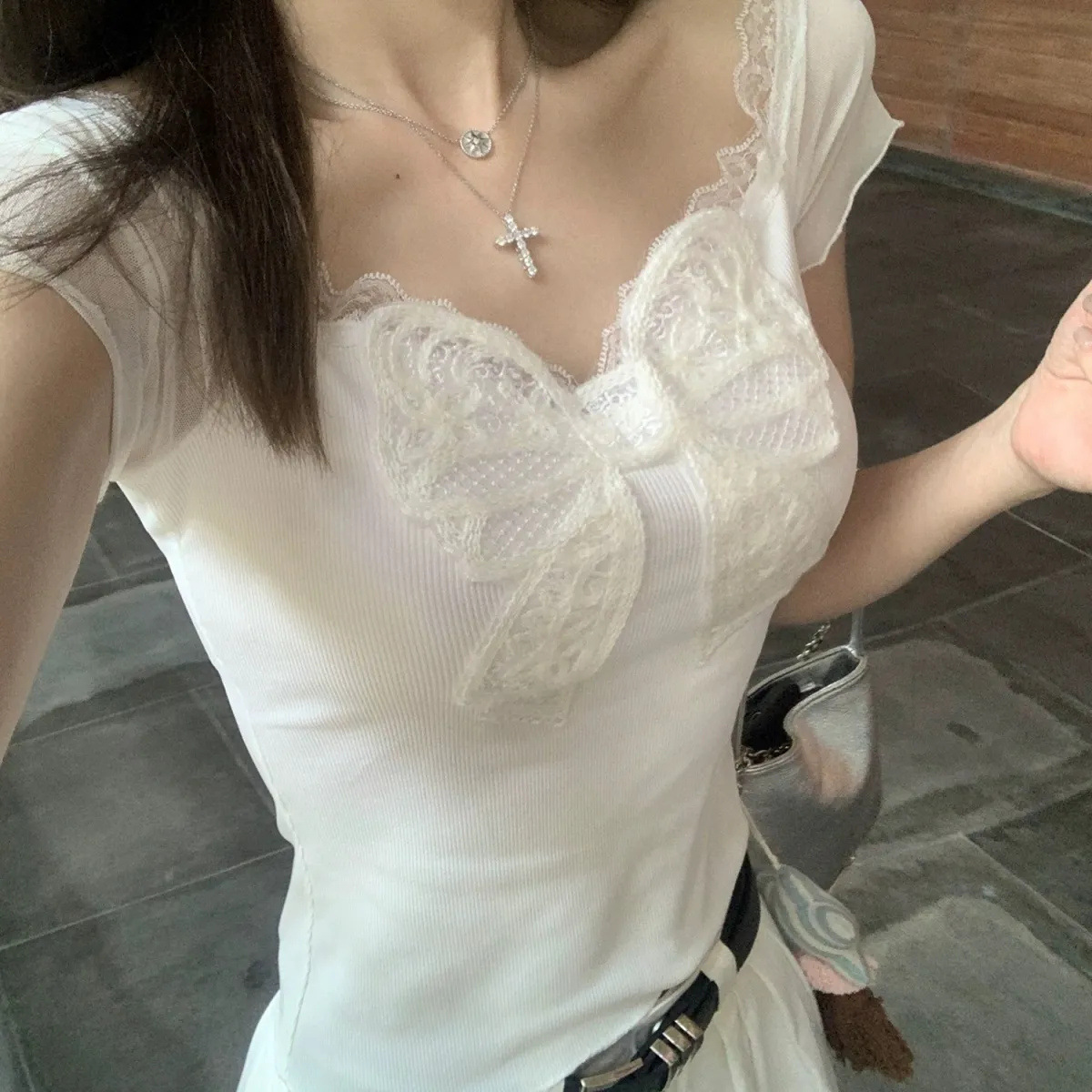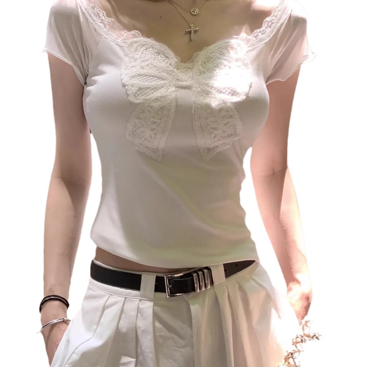 纯欲辣妹白色蕾丝蝴蝶结方领短上衣女夏季修身一字肩网纱拼接T恤