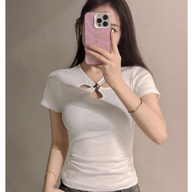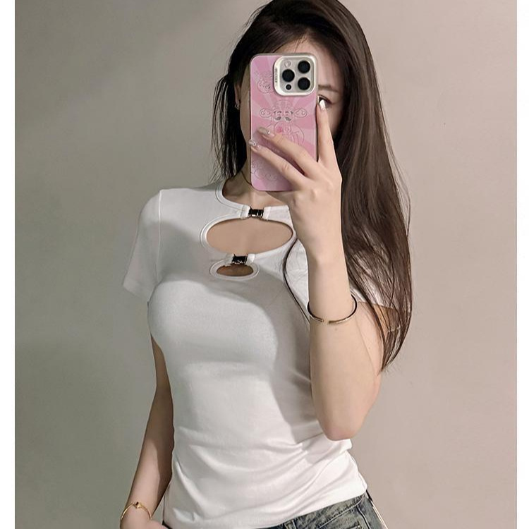 夏季性感镂空别致短袖t恤女设计感辣妹短款露脐气质上衣修身