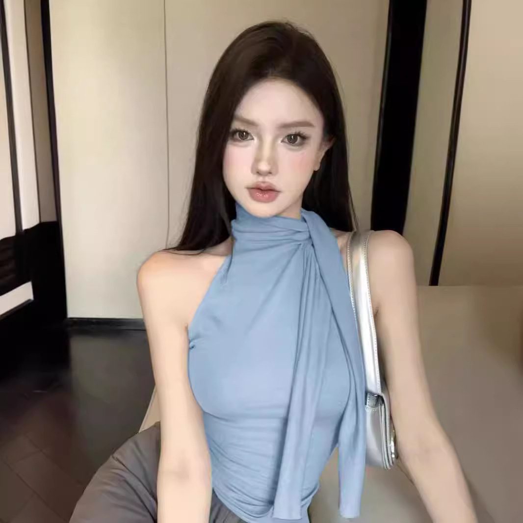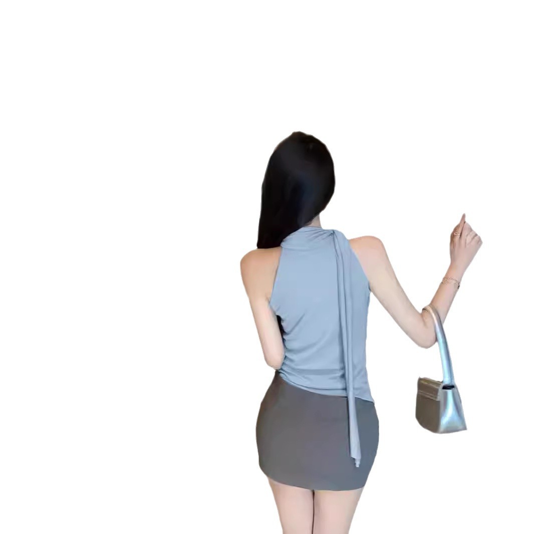 纯欲风无袖高领挂脖背心女夏季飘带外穿温柔气质修身内搭蓝色上衣