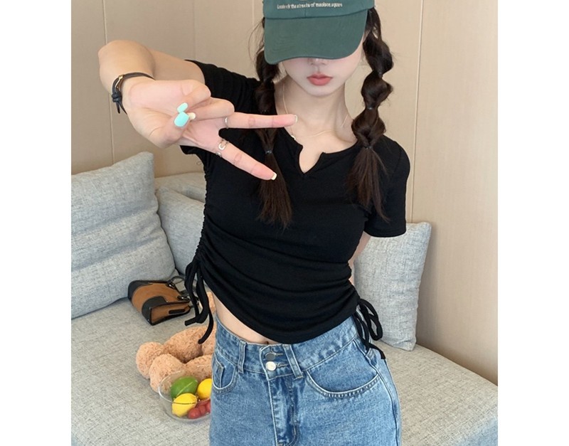 V领抽绳正肩t恤女夏季新款韩设计感小众修身显瘦短袖上衣潮
