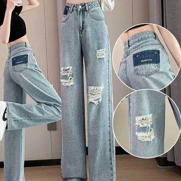 夏季破洞阔腿牛仔裤女韩版显瘦宽松高腰直筒裤子百搭潮拖地裤