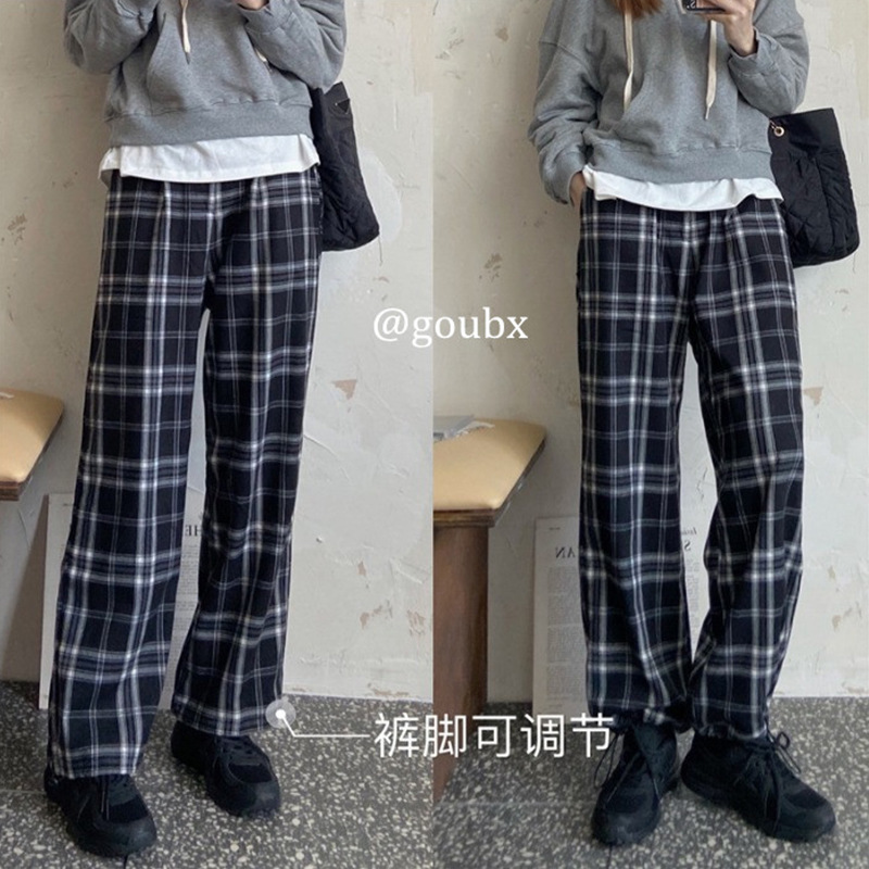 复古港风高腰宽松显瘦格子长裤女春秋直筒休闲束脚裤子