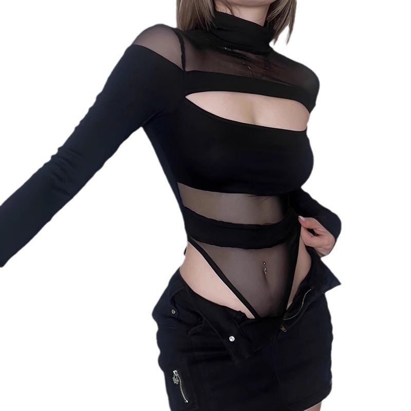 欧美禁欲系暗黑网纱透视镂空连体衣小众设计感辣妹半高领打底衫