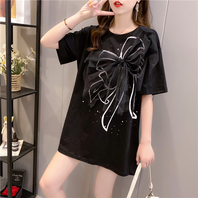 重工网纱拼接中长款蝴蝶结短袖体恤女t恤宽松显瘦欧货上衣