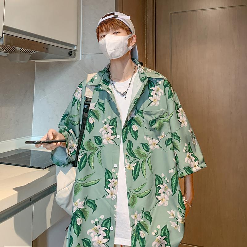 短袖花衬衫男夏季小众设计感美式潮牌痞帅五分袖衬衣宽松休闲外套