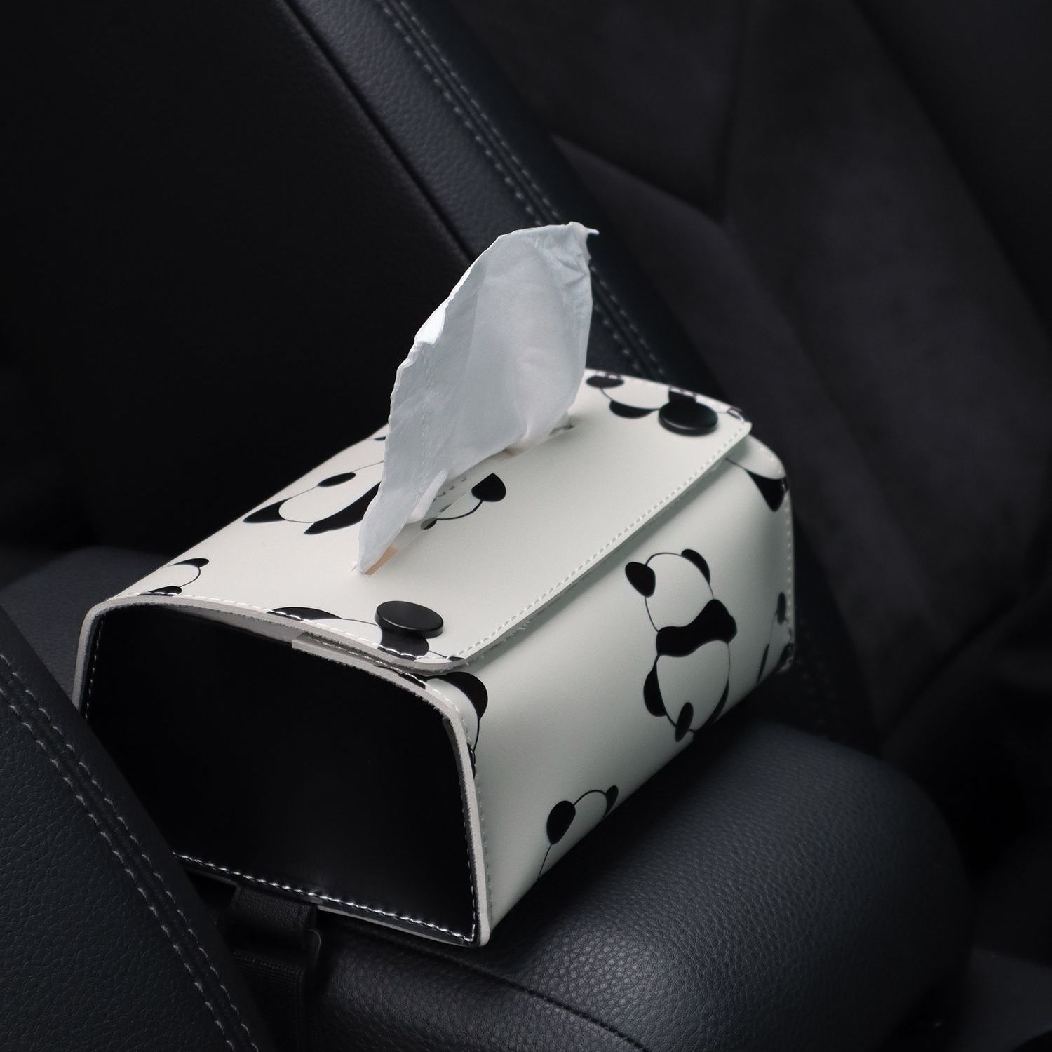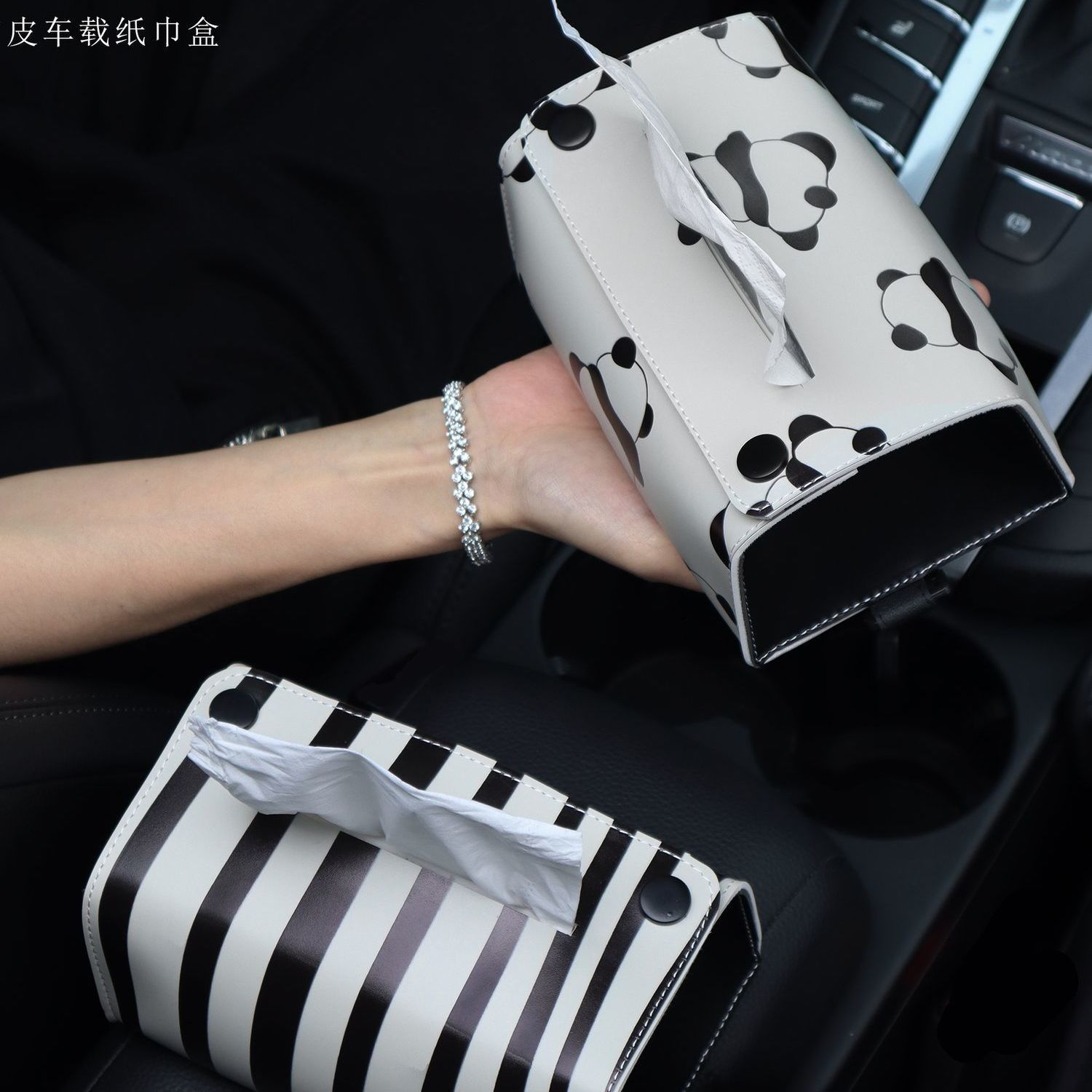 马鞍皮车载纸巾盒复古花纹中古黑白熊猫车载纸抽盒