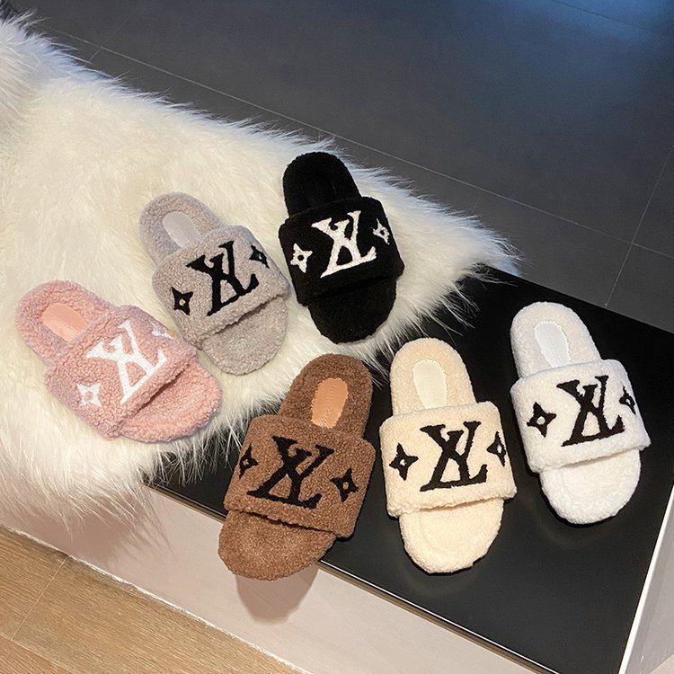 韩版女秋冬刺绣羊羔毛室内家居棉拖鞋外穿保暖一字毛毛拖