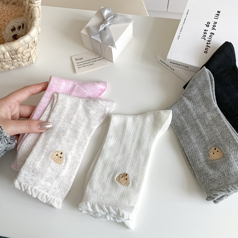 袜子女中筒袜夏季薄款网眼透气木耳花边卡通小熊刺绣女生堆堆长袜