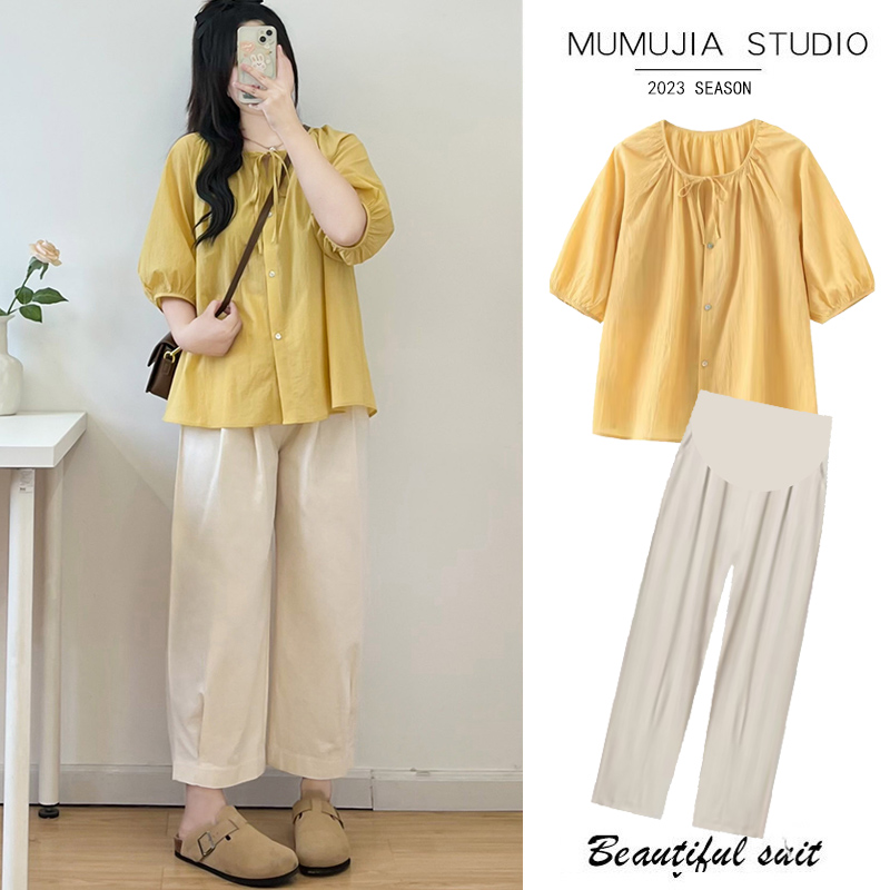 孕妇夏装套装时尚洋气宽松泡泡袖衬衫阔腿裤小个子孕妇装上衣夏季