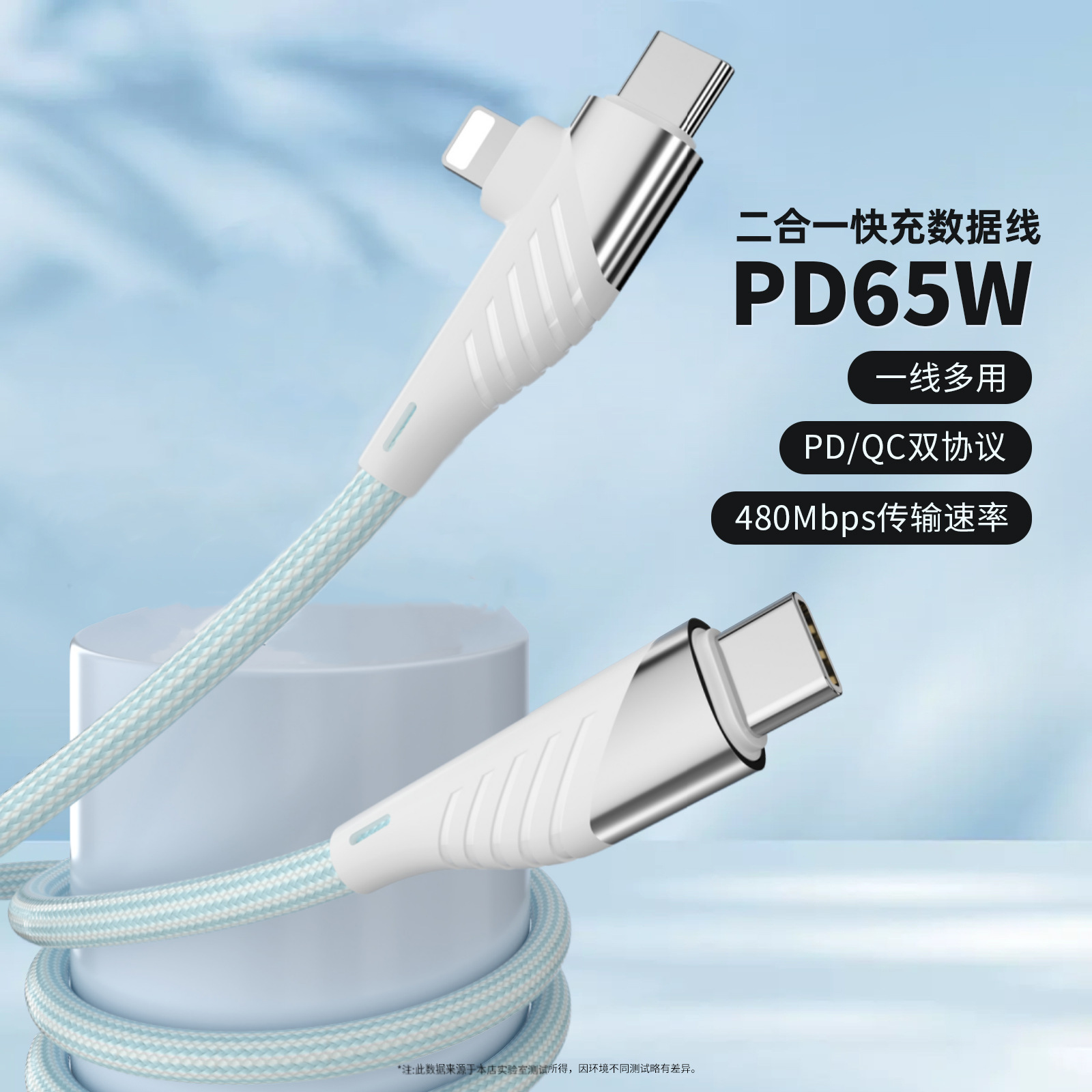 双Type-C一拖二快充数据线PD65W二合一适用苹果15充电线华为车载
