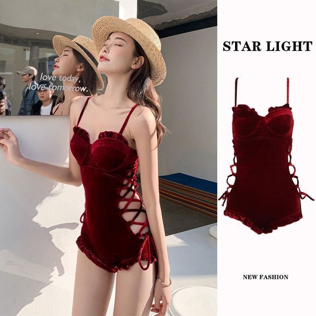 游泳衣女新款保守遮肚显瘦性感吊带复古丝绒连体泡温泉泳装
