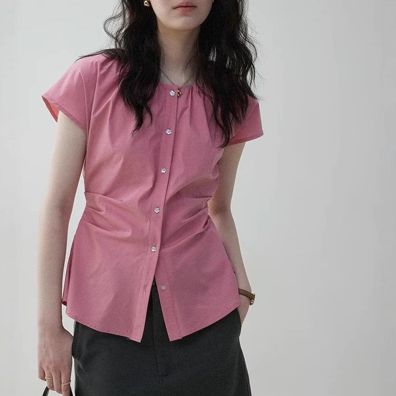 「VOEO」法式收腰褶皱绑带修身衬衫女夏季新款百搭显瘦通勤上衣