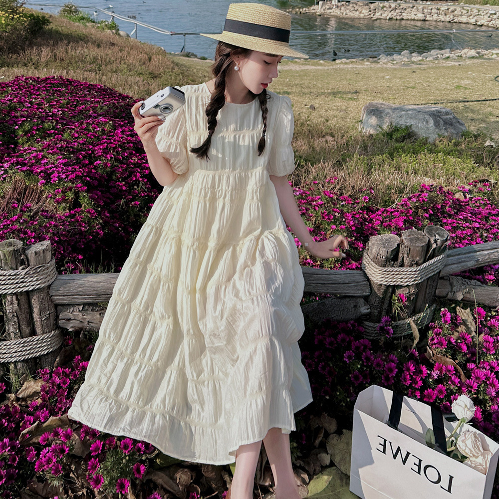 实拍米白色褶皱肌理感圆领套头泡泡袖小个子温柔风高腰显瘦连衣裙
