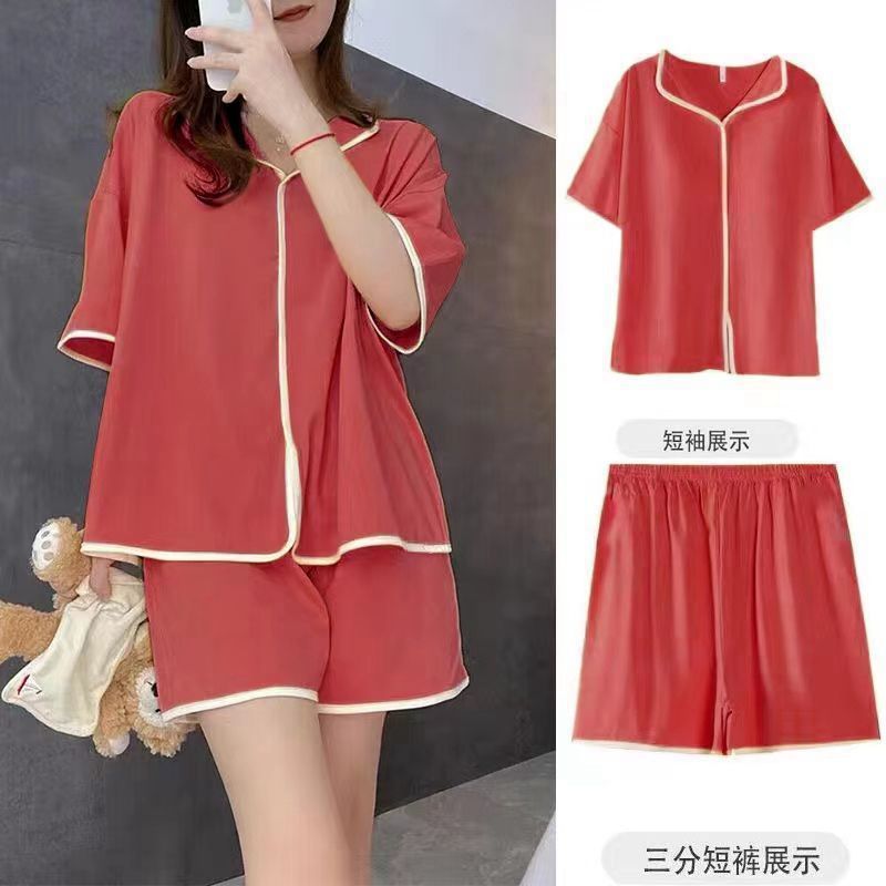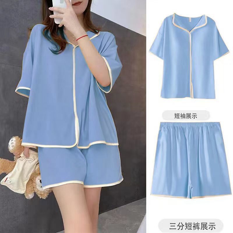夏季可外穿假开衫睡衣女短袖短裤纯色套装宽松家居服两件套