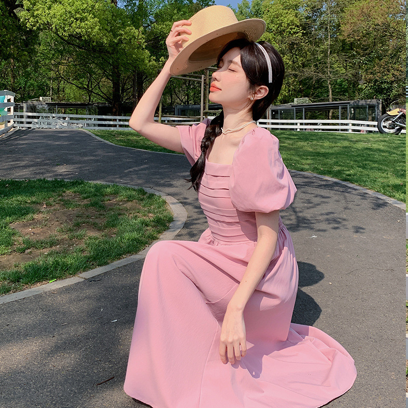 粉红色少女感方领泡泡袖连衣裙女夏新款韩版气质收腰法式长裙