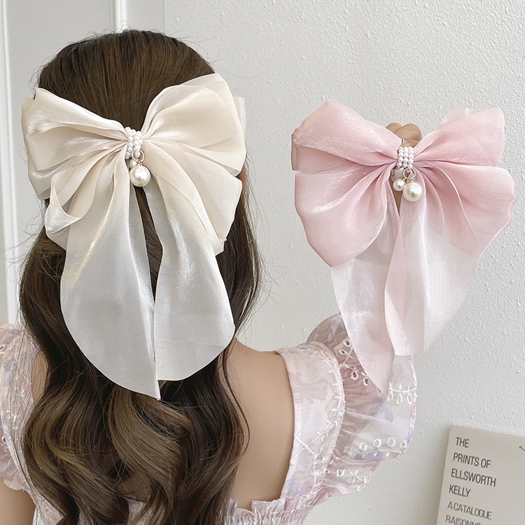 纯色大蝴蝶结珍珠吊坠发夹头饰日韩高级感顶夹百搭头饰弹簧夹