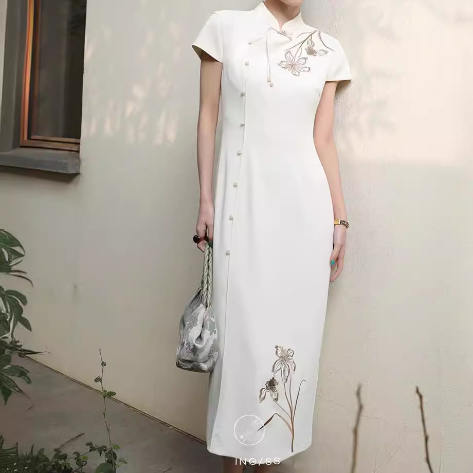 一独幽幽新中式连衣裙女夏季国风鸢尾花刺绣旗袍裙