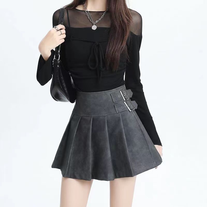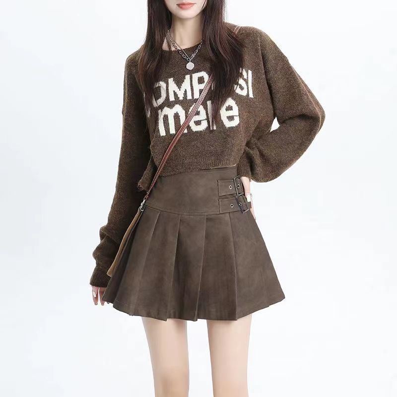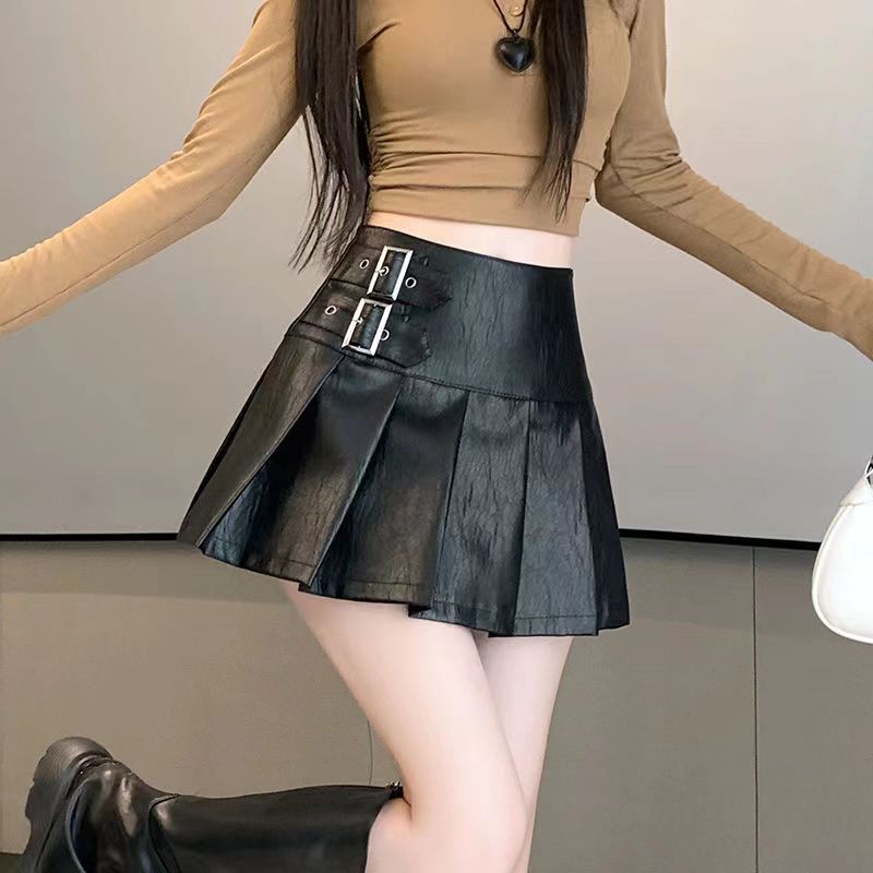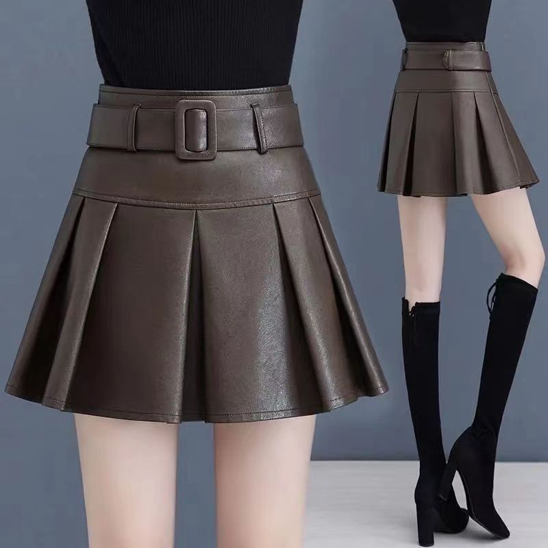 大码胖MM咖色皮裙半身裙女新款高腰显瘦pu皮a字百褶短裙
